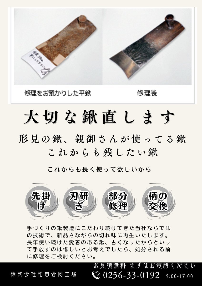 古いも新品の切れ味に! 「もう捨てようと思ってた…」が「まだまだ使える!」に変わる瞬間✨ 大切なの修理承ります! (株)相田合同工場 新潟県三条市田島1丁目7-4 ➿▶︎0800-100-9881 TEL▶︎0256-33-0192 # #修理 pic.x.com/aryhxZLBXz