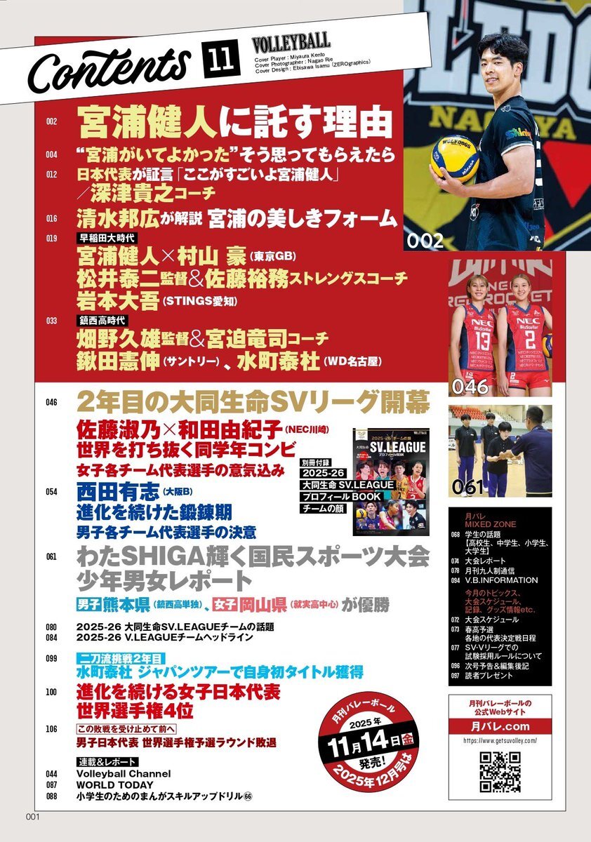 #月刊バレーボール 11月号は 10月15日(水)発売‼️   別冊付録:2025-26 大同生命SV.LEAGUE プロフィールBOOK チームの顔   表紙と目次はこちら👀   #宮浦健人 #ウルフドッグス名古屋 #深津貴之 #清水邦広 #早稲田大学 #村山豪 #松井泰二 #佐藤裕務 #岩本大吾 #鎮西高校 #畑野久雄 #宮迫竜司 #鍬田憲伸 pic.x.com/hb0GWHSUyM