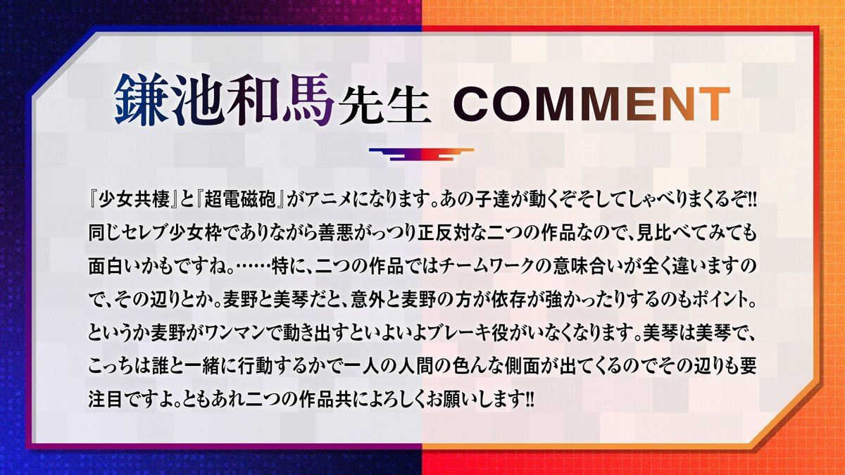 #鎌池和馬 先生より、 『とある暗部の少女共棲』&『とある科学の超電磁砲』第4期 TVアニメ化決定のお祝いコメントが到着✨‼️ #少女共棲 #アイテム #超電磁砲 #超電磁砲4期 #とある pic.x.com/ur1EFrOhIR