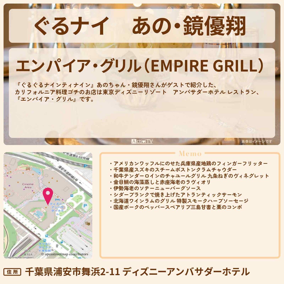 #ぐるナイ ディズニー・カリフォルニア料理ゴチ #あの ちゃん・ #鏡優翔 さんがゲスト 『エンパイア・グリル』の情報 【住所】 千葉県浦安市舞浜2-11 詳しくは👉 activitv.com/entry/gurunai_… #ぐるぐるナインティナイン #ナインティナイン #岡村隆史 #矢部浩之 #増田貴久 #NEWS #小芝風花 #高橋文哉 pic.x.com/AZLPA5KYV1