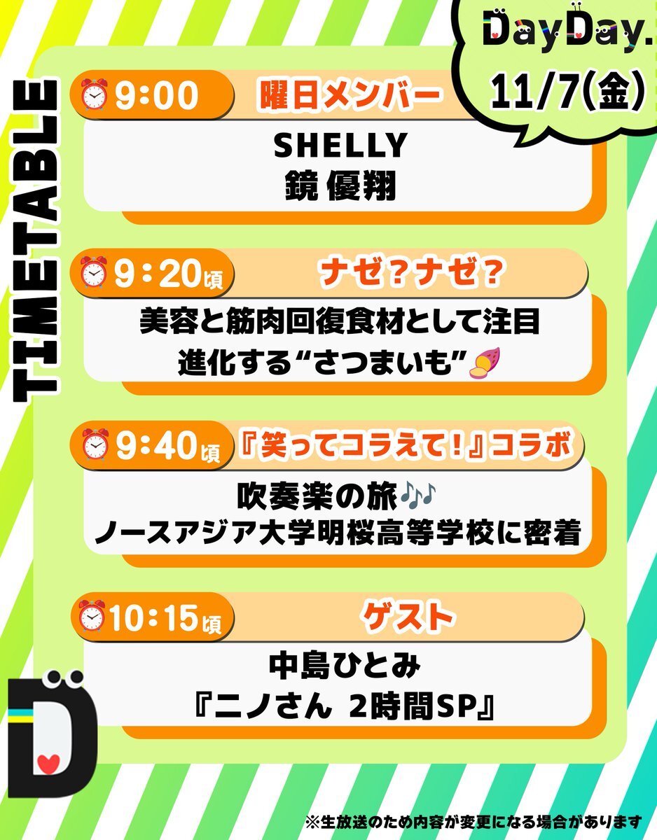 \11/7(金)の #DayDay./ ◆曜日メンバー ☀️#SHELLY (@shellysproject) 🤼#鏡優翔 (@yuukagami0914) ◆ナゼ?ナゼ?🤔 美容と筋肉回復食材として注目 進化する“さつまいも”🍠 ◆ 『笑ってコラえて!』コラボ 吹奏楽の旅🎶 ノースアジア大学明桜高等学校に密着🎥 ◆ゲスト 🏃♀️#中島ひとみ (@g713__8) pic.x.com/9iq3hhnmFj