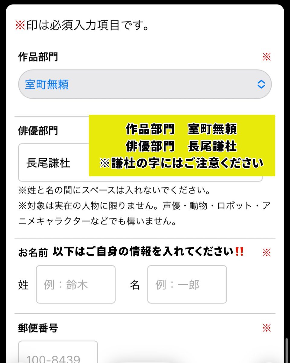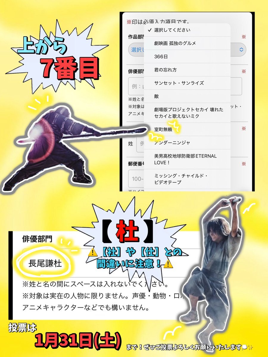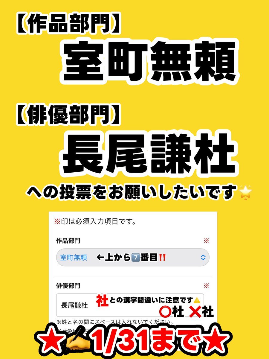 #日本アカデミー賞 #話題賞 の投票が始まりました✨ アカデミー賞の中で唯一、一般の方が投票に参加できる賞なのでご協力お願いいたします! 作品部門➡️室町無頼 俳優部門➡️長尾謙杜 (漢字間違いに気をつけてください🙇🏻♀️ 🔗ssl.1242.com/aplform/form/a… 【締切 1/31(土)まで⚠️】 #長尾謙杜_映画賞投票 x.com/muromachiburai…