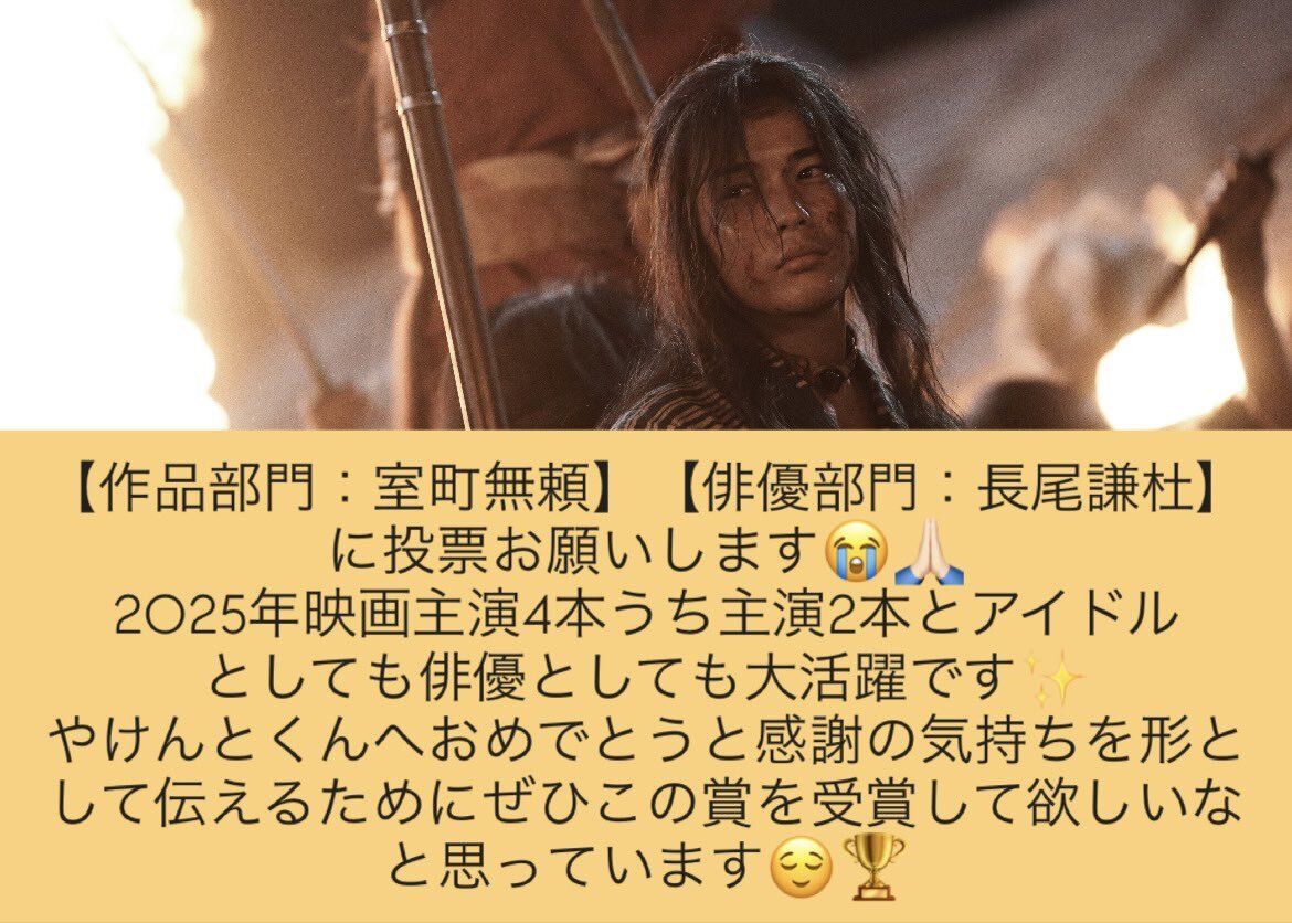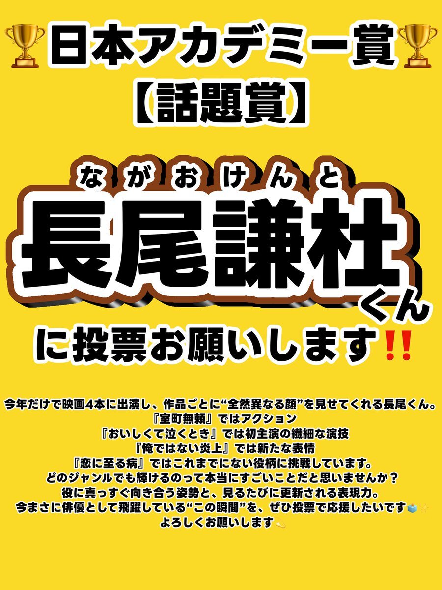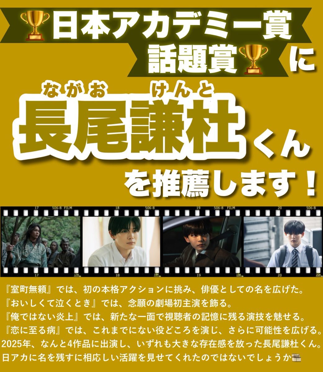 🏆日本アカデミー賞 話題賞🏆 作品部門:室町無頼 俳優部門:長尾謙杜 にて投票のご協力お願い致します🙏🏻 #長尾謙杜 #長尾謙杜_映画賞投票 x.com/ann_since1967/…