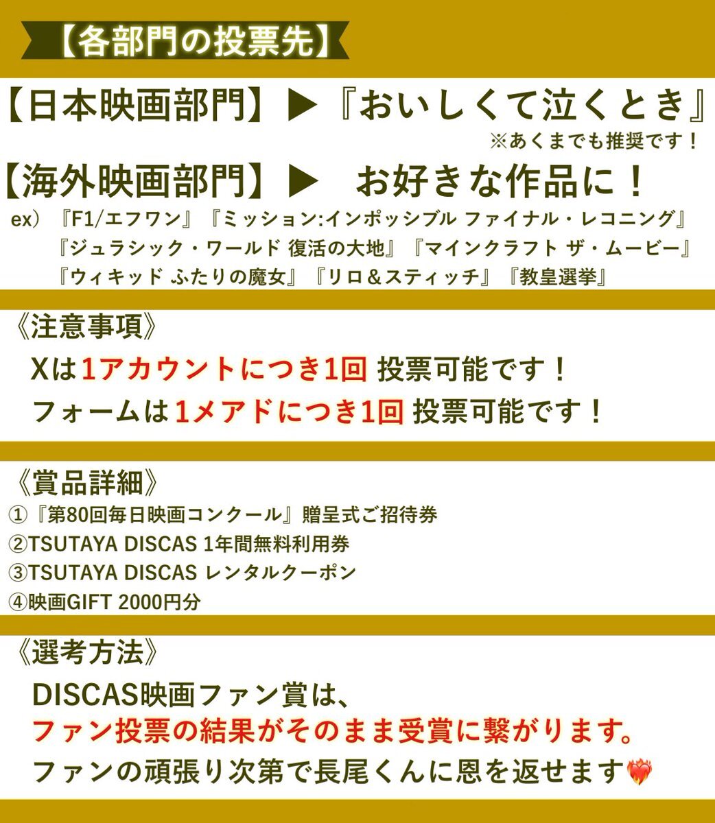 こちらもまだの方はぜひお願いいたします🙇🏻♀️ ①@TSUTAYA_DISCASをフォロー ②日本映画部門 ▶︎【おいしくて泣くとき】 希望の賞品番号 ▶︎①~④を選択、引用リポスト さらにご協力頂ける方は下記フォームからもお願いいたします🙇🏻♀️ movie-tsutaya.tsite.jp/components/dcp… #長尾謙杜_映画賞投票 x.com/728shonaga/sta…
