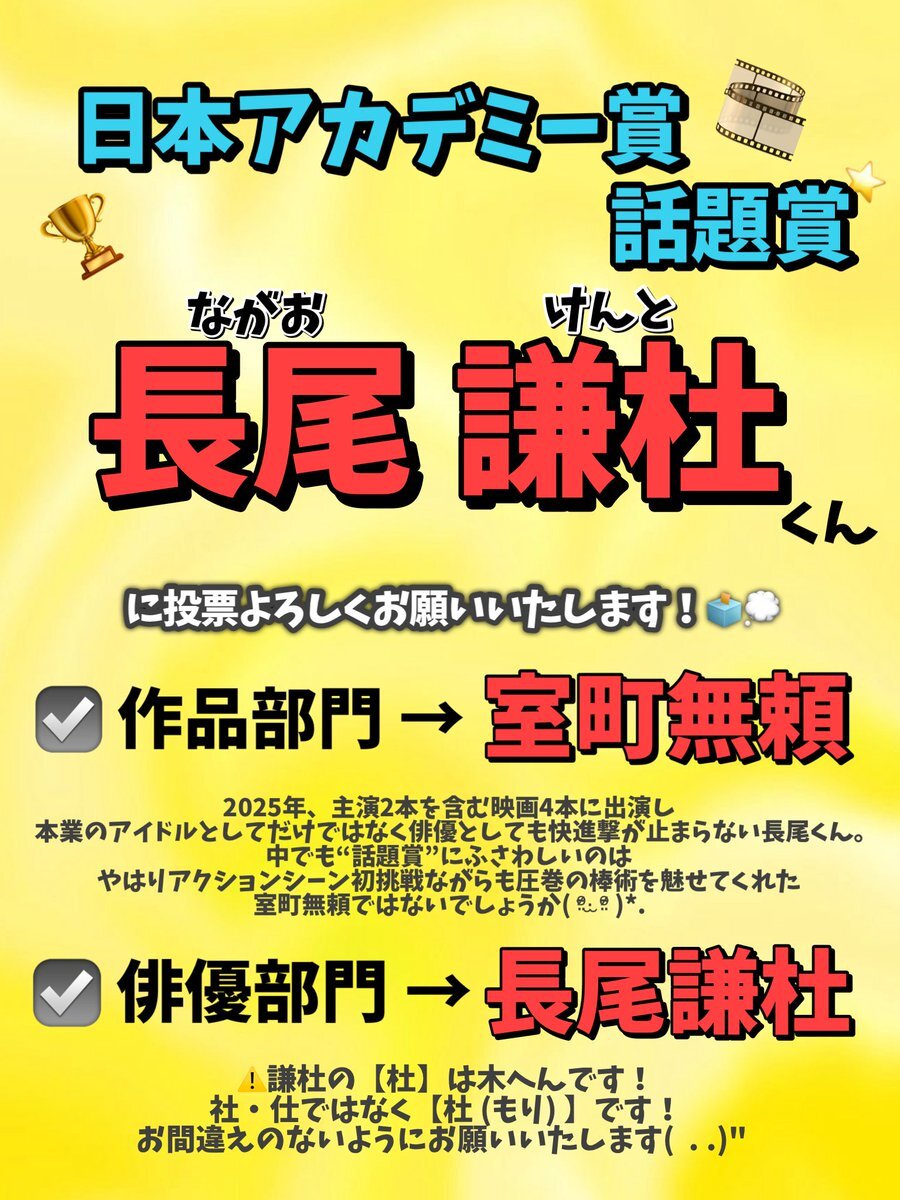 #日本アカデミー賞 は #長尾謙杜 くんへの投票お願いします😭😭😭 【投票期間】 2025/11/28~2025/1/31 🔗ssl.1242.com/aplform/form/a… 作品部門➡️室町無頼 俳優部門➡️長尾謙杜 に投票 ご協力お願いします🙇🏻♀️💛 #長尾謙杜_映画賞投票 x.com/Ann_Since1967/…