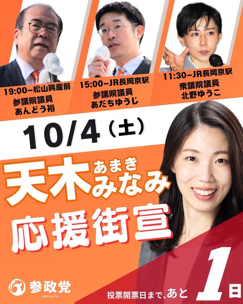 明日投票日です! 京都府・長岡京市議会議員選挙 【天木みなみ(あまきみなみ)】 長岡京駅、松山興産前にて 街頭演説もあります🎤ぜひ!! 長岡京市の皆様、 どうぞ宜しくお願い致します🙏✨️ #天木みなみ #あまきみなみ #参政党 #京都府 #長岡京市 #長岡京市議会議員 #選挙 x.com/sanseito_kyoto…