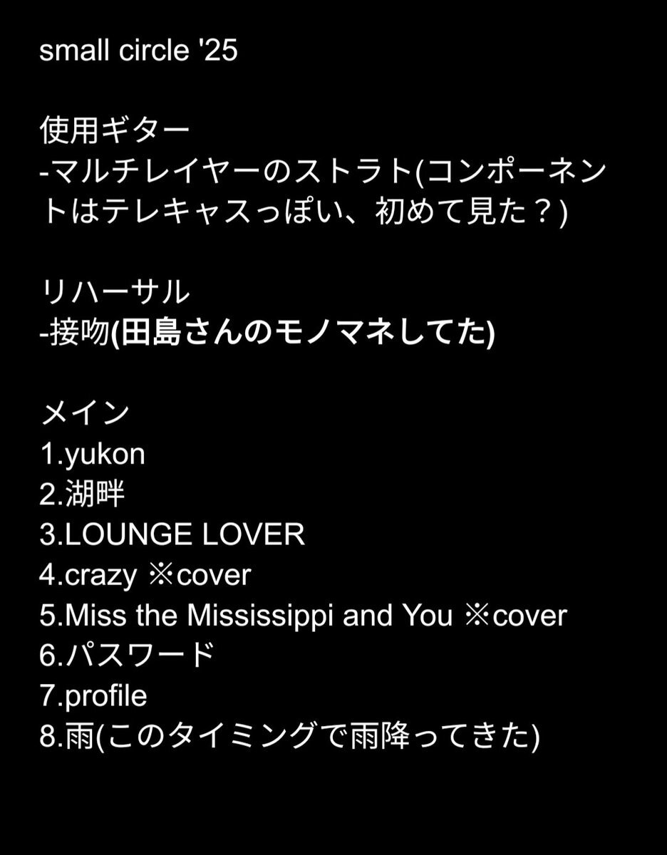 スモールサークル、長岡亮介さんのセトリです。 記憶頼みなので抜け漏れ順番違いあったらごめんなさい! #smallcircle25 #長岡亮介 #ペトロールズ pic.x.com/ziVvIuH31j