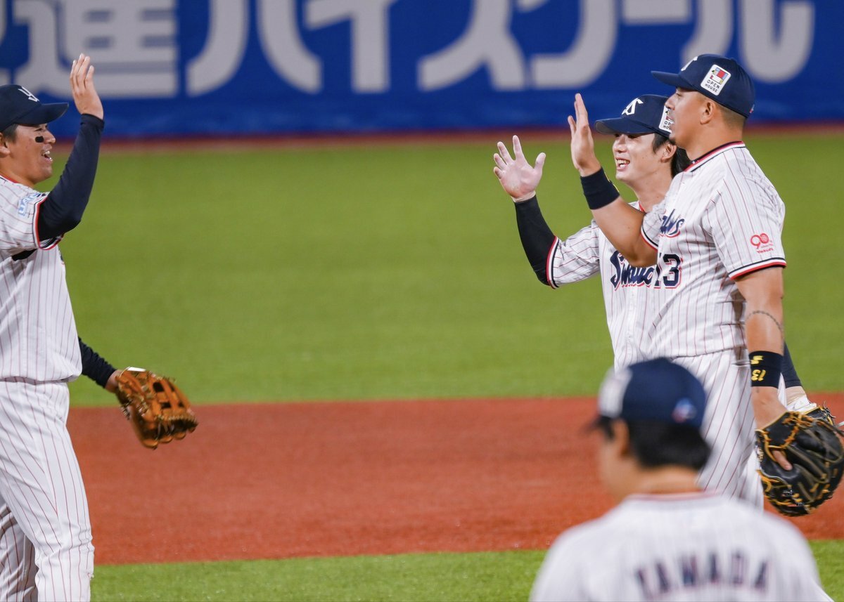 ホームインして戻ってきた秀樹 高津監督に向けた笑顔が🥹 (たぶんハイタッチまたしてくれなかった😂) そして最後ケリーからの攻撃をかわす秀樹🤭 photo:2025.10.4マツダスタジアム #長岡秀樹 pic.x.com/dLbkqmG5XV