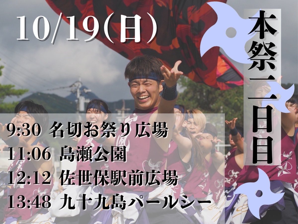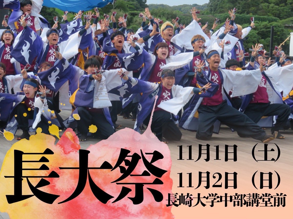 11月1日(土)、2日(日)に長大祭にて演舞させていただきます。詳細は画像をご覧ください🥷 今年も、今年度オリジナル楽曲「導」だけでなく、昨年度オリジナル楽曲「勇な謳」やソーラン節、総踊りも披露させていただきます🐳 ご声援の程よろしくお願いします! #長崎大学突風 #長大祭 pic.x.com/VUqCWG9ROm