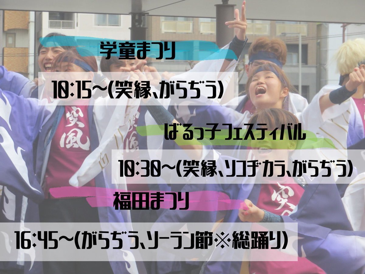 11月8日(土)に3つのお祭りで演舞させていただきます! どの祭りも会場の皆さんと一緒に踊れる曲がありますので、会場一体となって楽しみましょう☺️ 皆さんぜひお越しください‼︎ ご声援の程よろしくお願いします! #長崎大学突風 #学童まつり #ばるっ子フェスティバル #福田まつり pic.x.com/fO361foyNH