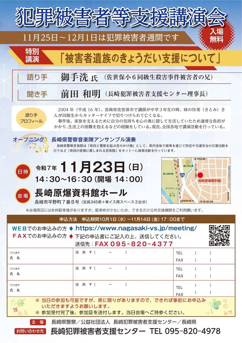 【被害者支援室】  令和7年11月17日(月)12:10~12:50「警察本部3階エントランス」、同年11月18日(火)12:10~12:50「県庁1階エントランスホール」で犯罪被害者キャンペーンを行います。  県警音楽隊によるフルート演奏もありますので、ぜひ、御参加ください。 #長崎県警察 #長崎県 #被害者支援 pic.x.com/dRJDL86e1R