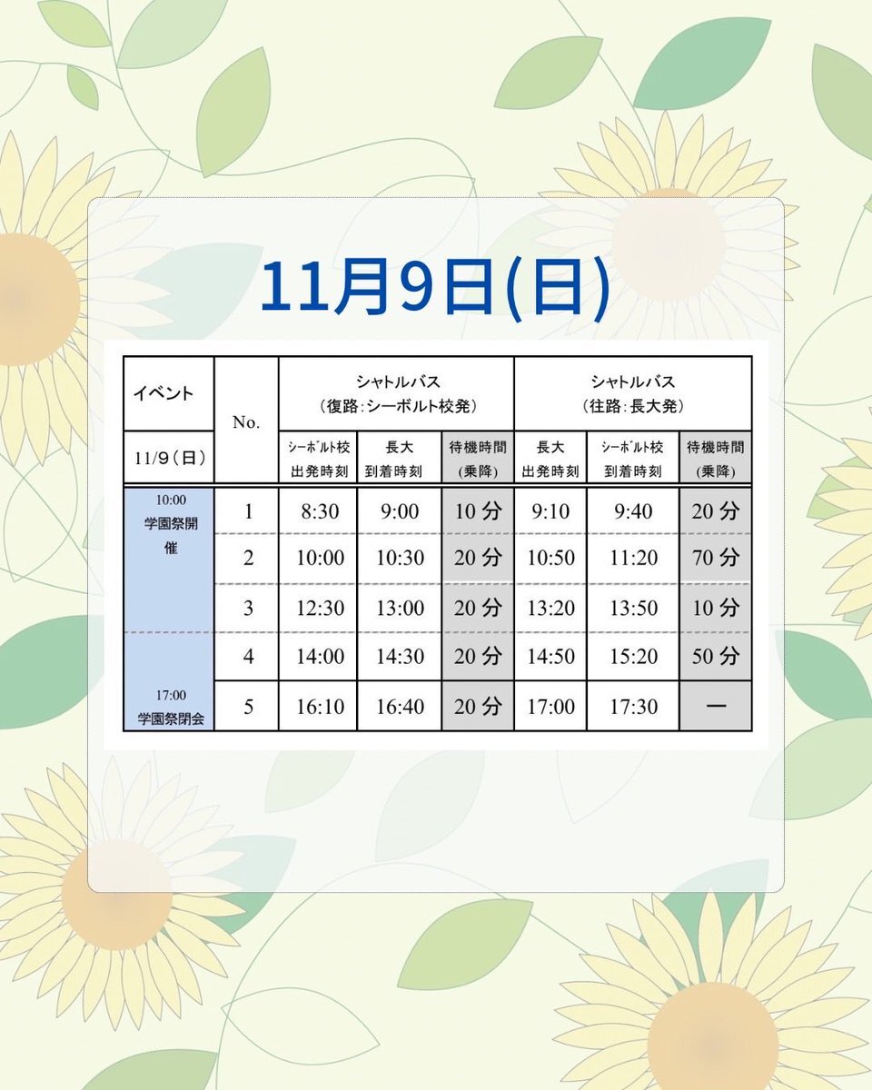 🚌【シャトルバス運行中!】🚌 本日、長大からシーボルト校行き、シーボルト校から長大行きのシャトルバスが出ています!✨ 次の便は シーボルト校発 14:00 長大発 14:50です! 学園祭に来る方はぜひご利用ください🌻 ※時刻表は画像をチェック! #SUNFESTA #学園祭 #長崎県立大学シーボルト校 pic.x.com/HPCJbZ51Dy