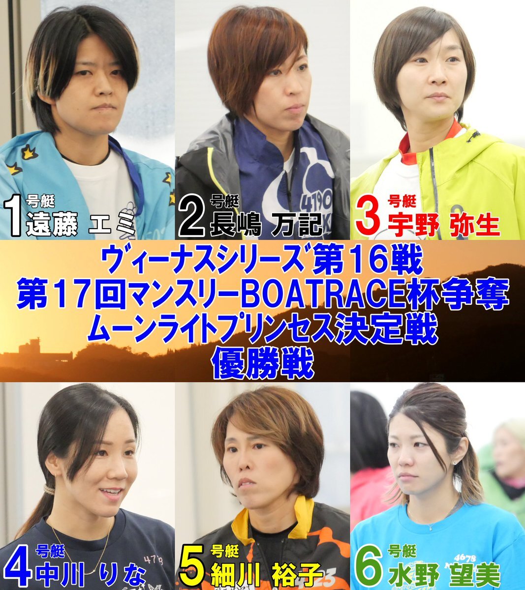 #ボートレース蒲郡#ヴィーナスシリーズ第16戦 #ムーンライトプリンセス決定戦 準優3レースが終了し、27日の12Rで争われる優勝戦メンバーが決定した。 12R ① #遠藤エミ(滋賀) ② #長嶋万記(静岡) ③ #宇野弥生(愛知) ④ #中川りな(福岡) ⑤ #細川裕子(愛知) ⑥ pic.x.com/4ATPLUIhwX