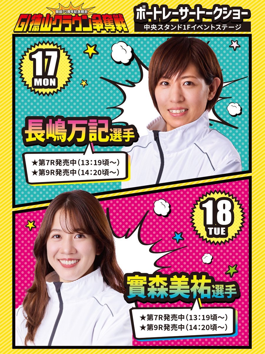 🏆 GⅠ徳山クラウンまであと7日! 徳山の熱い一週間が、もうすぐ始まります🔥 ボートレーサートークショーのゲストレーサーが決定! ◎11/17(月) #長嶋万記 選手 ◎11/18(火) #實森美祐 選手 その他のイベントやレース情報は特設サイトをチェック👇 🔗 b-race.jp/202511GI18/ #G1 pic.x.com/kMFVx4cwlb