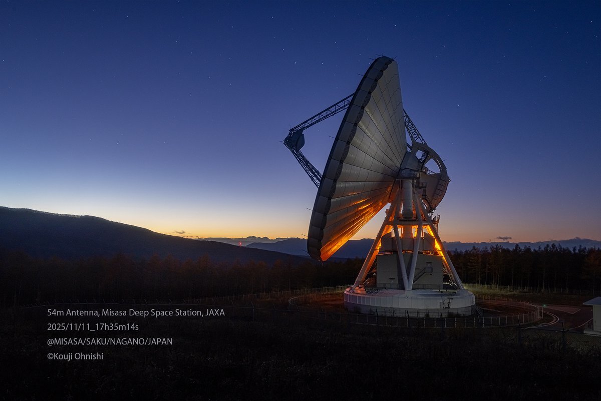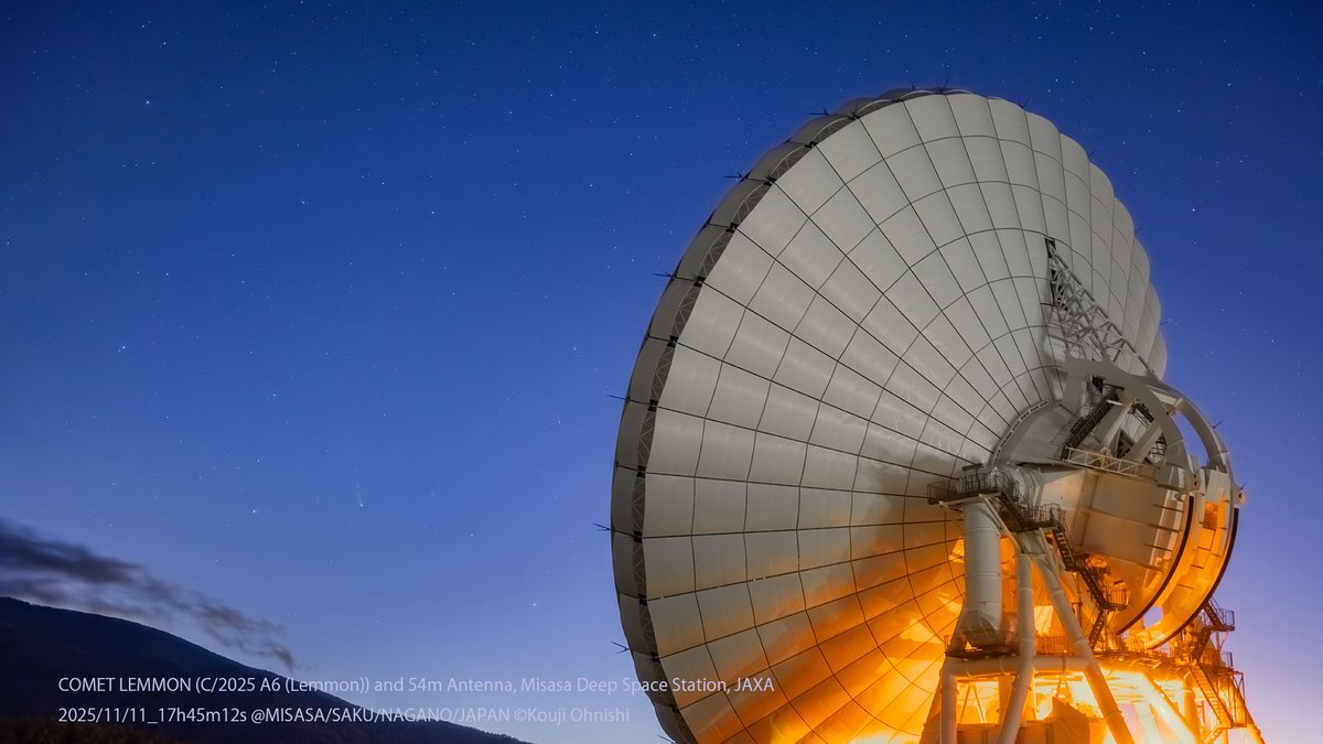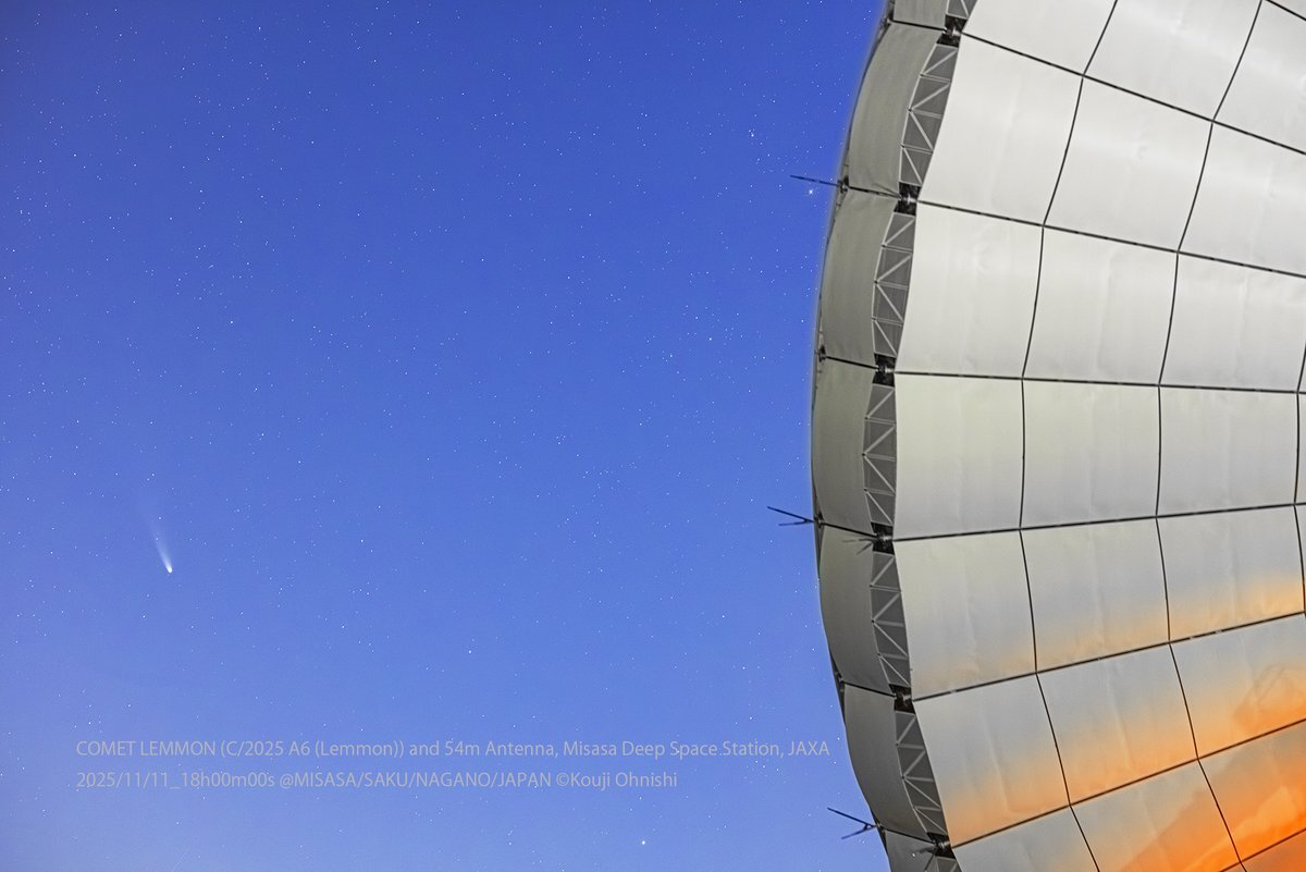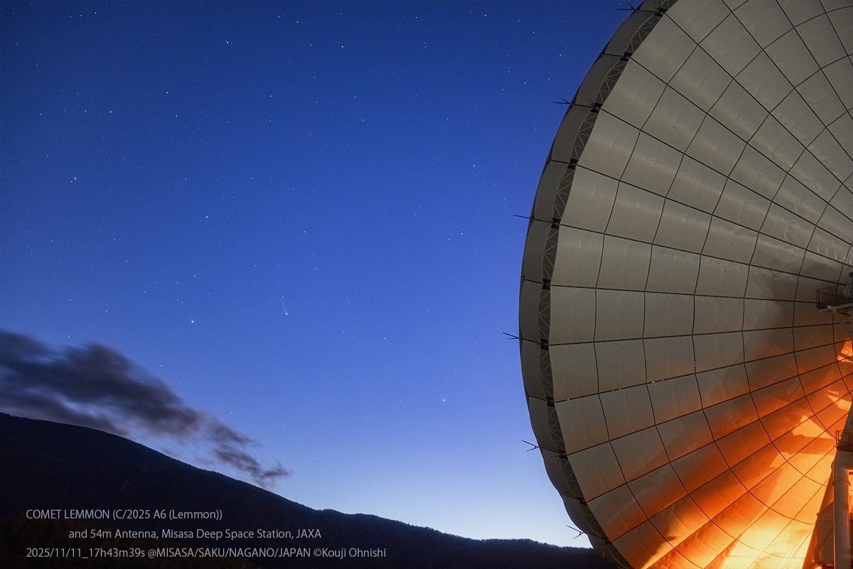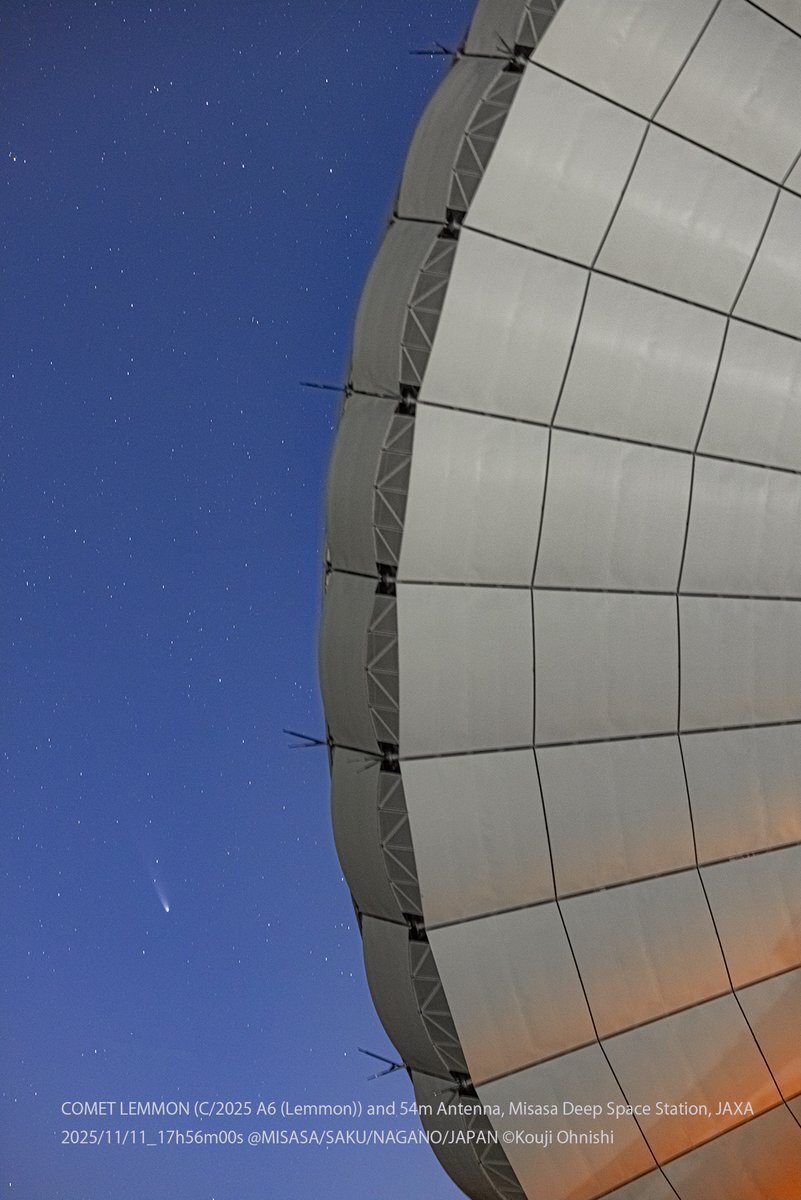 薄明に染まる #美笹54mパラボラアンテナ の向こうに 去りゆくレモン彗星が見えていた。11月8日、近日点通過直後で、まだ、活発な彗星活動が見られる。 #JAXA #美笹54m #レモン彗星 C/2025 A6 (Lemmon) #長野県は宇宙県 pic.x.com/a1wdpa8yCc x.com/koujiohnishi/s…