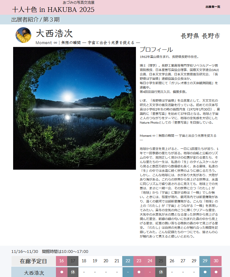 君も名探偵!? 長野県でホシを探そう! あずみの写真交流展「十人十色 in HAKUBA2025」第3期 大西浩次・星景写真展 ギャラリートーク 11月 16日 (日曜日)⋅13:30~15:00 ギャラリーキリア ジャポニカ (Kirria Japonica) 〒399-9211 長野県北安曇郡白馬村神城6586 uchuuken.jpn.org/2025tantei/ind…