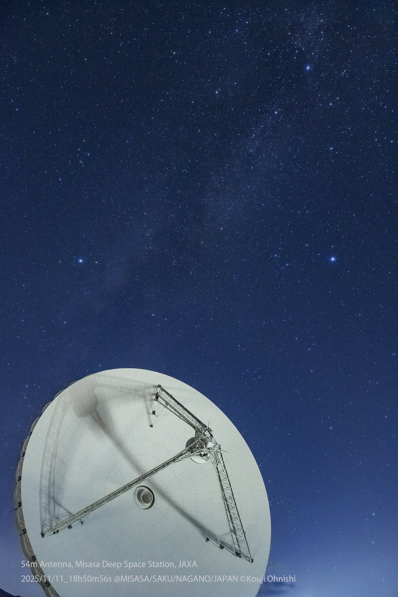 #今日の星景写真 2025年11月13日 「美笹54mパラボラアンテナと夏の大三角」 撮影:2025/10/11 #佐久市 夏の大三角が美笹の54mの上に輝く。 #夏の大三角 #美笹深宇宙探査用地上局(#美笹局) #54mアンテナ #美笹54m #長野県は宇宙県 pic.x.com/uIwv42m52E