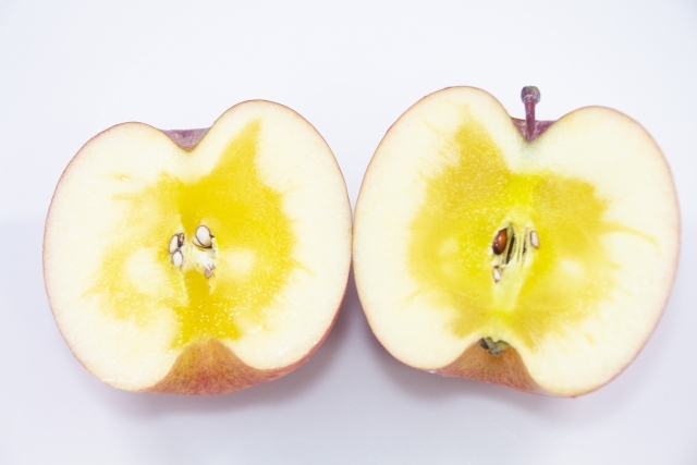 皆さんよく見てね! リンゴの中心部分の黄色いところ✨️ これは「蜜」って呼ぶんです。 甘く熟した印🍎 腐ってる?と勘違いされちゃうこともあるみたい🥺 安心してお召し上がりください‼️ 「サンふじ」は、袋がけせずに太陽いっぱい浴びた「ふじ」のこと☀️ 美味しいよ😋︎💕︎ #長野県りんごの日 x.com/nagano_b/statu…