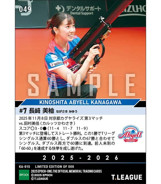 ■EPOCH-ONE■🏓✨ #木下アビエル神奈川(@Abyell_Kanagawa) (25.11.8 🆚京都カグヤライズ) 【#長﨑美柚】 ✨前人未到✨ Tリーグ史上初の「60-60」達成✨ 1枚¥500(送料無料) #メモリアルカード 11/21(金)16時~72時間限定 受注販売開始! epoch-card.com/shop/r/r25/ #エポックワン #Tリーグ #卓球 pic.x.com/9BEIpXgFty