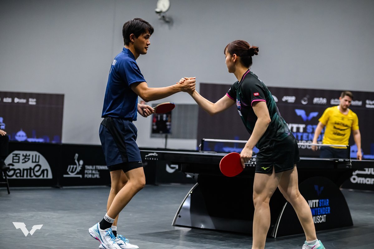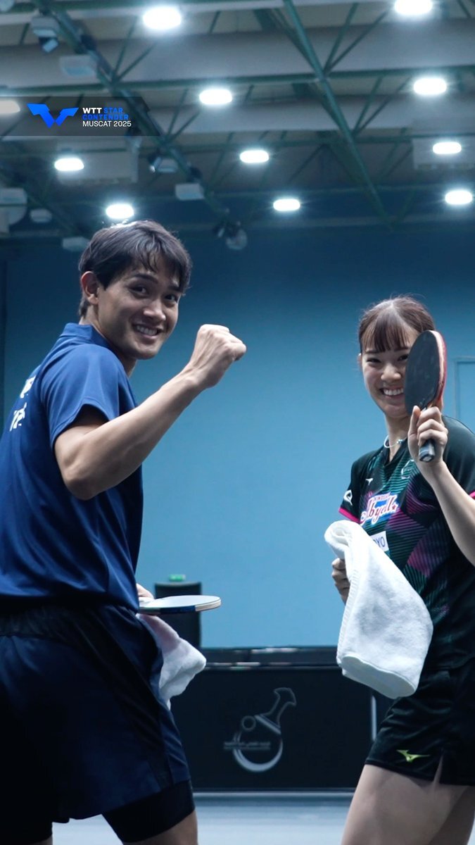All smiles from the Japanese Mixed Doubles pair! 👋 Yoshimura/Nagasaki topple No.4 seeds Karlsson/Kallberg and are through to the Quarterfinal!🙂↕️🔥 #WTTMuscat #TableTennis