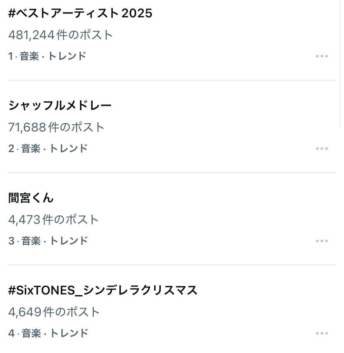 team SixTONESってほんとツイ廃なんだな笑 間宮くんトレンド入りして、シンデレラクリスマスがまだトレンド入りしてる。笑 #ベストアーティスト2025 #間宮くん pic.x.com/SpH3DOjKX4