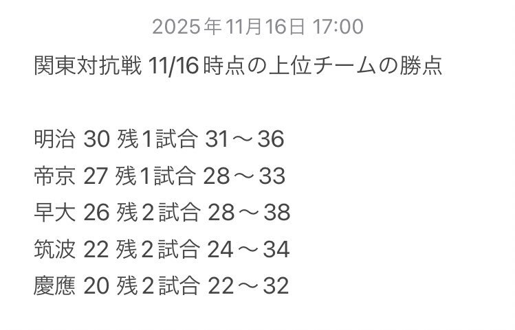 皆さんお待ちかね、算数のお時間です! 明治は早明戦に勝利すれば、他校の勝敗にかかわらず対抗戦優勝です😆 もし早大に敗れた場合、可能性では2位から5位まであり得ます。 一番ありそうな筑波2連勝、慶應2連敗のシナリオでは明治は4位となり、大学選手権準々決勝では筑波と戦うことになりそうです。