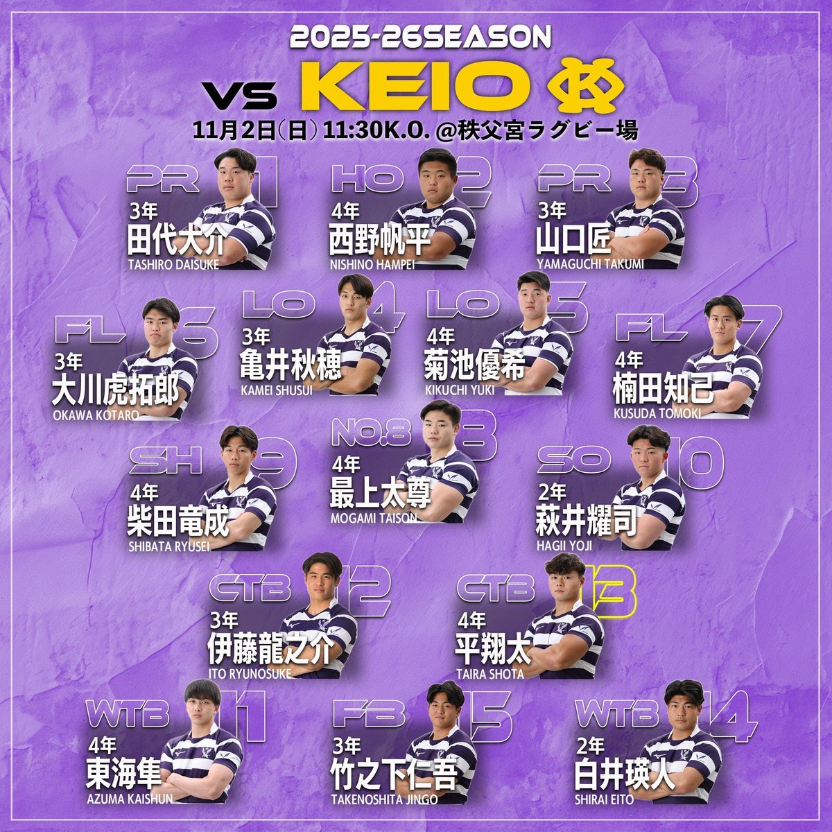 慶應義塾大学戦メンバー発表❗️ #明治大学ラグビー部🏉 #前へ‼️ #関東大学対抗戦A🏉 pic.x.com/nOQZKBnPe9 x.com/meijirugby/sta…