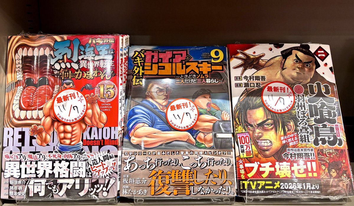 【新刊入荷】 #バキ外伝 ガイアとシコルスキー⑨ #バキ外伝 烈海王は異世界転生しても一向にかまわんッッ⑮ #WORST外伝 グリコ 35 #ドクロ⑳ #弱虫ペダルSPARE BIKE⑮ #ヤンキーJKクズハナちゃん 28 #阿佐ヶ谷サキュバス同人物語① #閻魔の教室② 23時まで営業中💁♀️ #弁天町 #ブックスB pic.x.com/sBjTaEbDNf