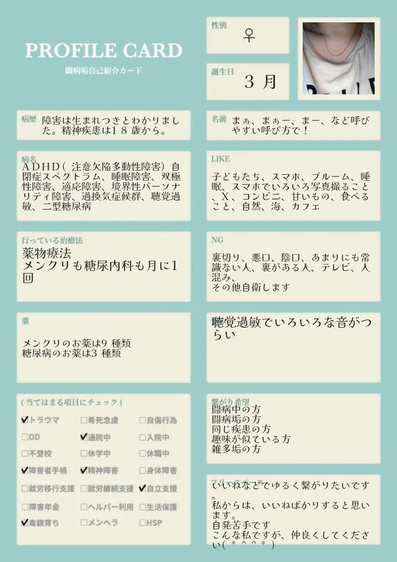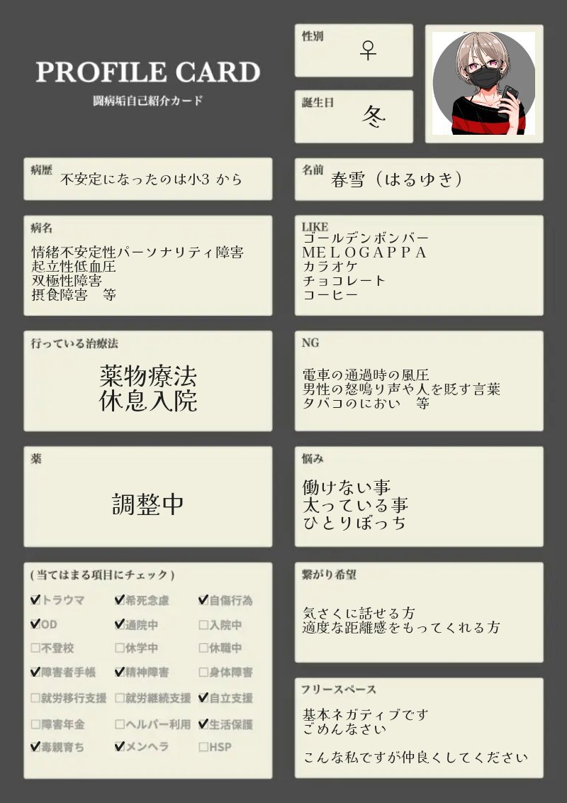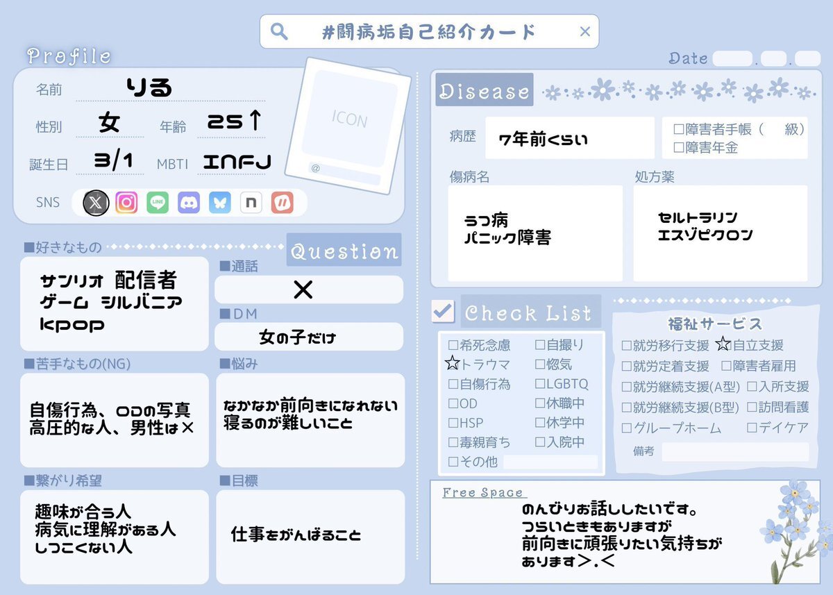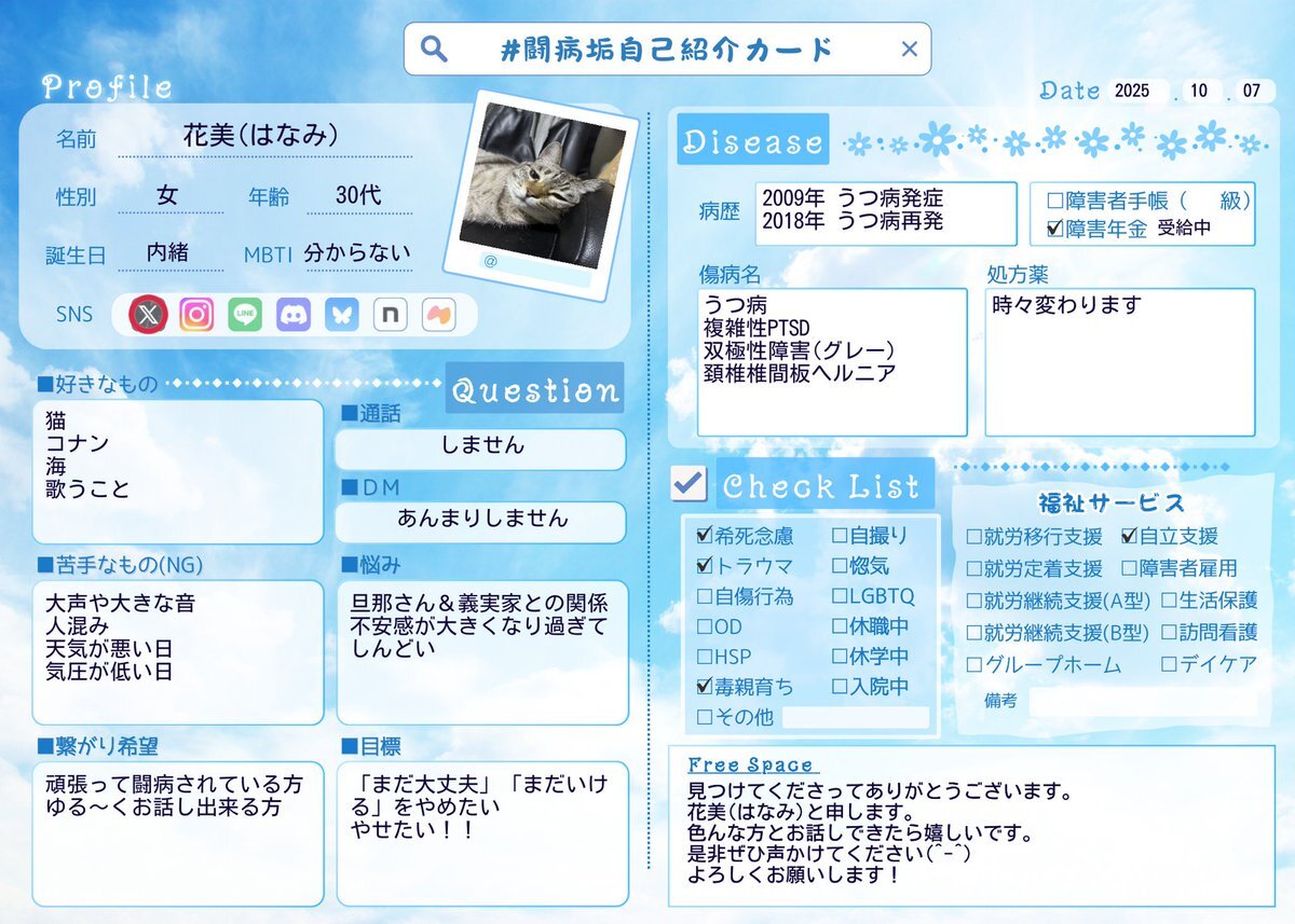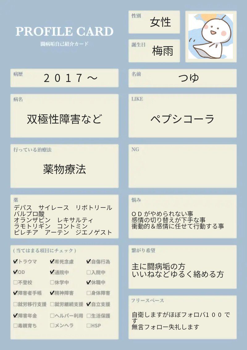 作りたての闘病垢が 検索にちゃんと乗るようになったので 再投稿します〜 相互フォローよろしくお願いします #闘病垢さんと繋がりたい #闘病垢さんと仲良くなりたい #病み垢さんと繫がりたい #闘病垢自己紹介カード pic.x.com/N5GV3DiN7z