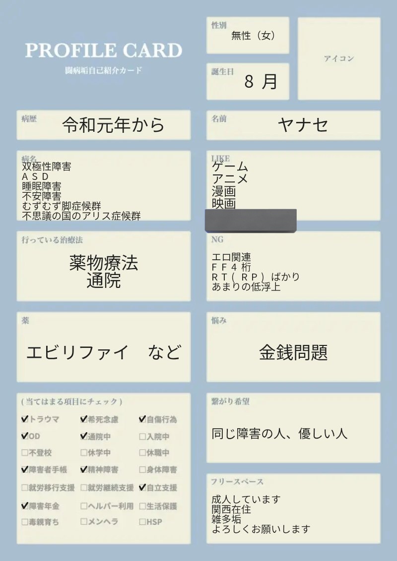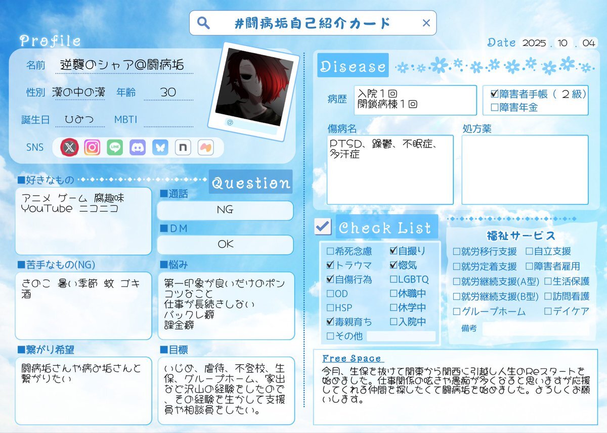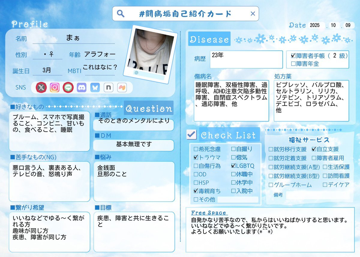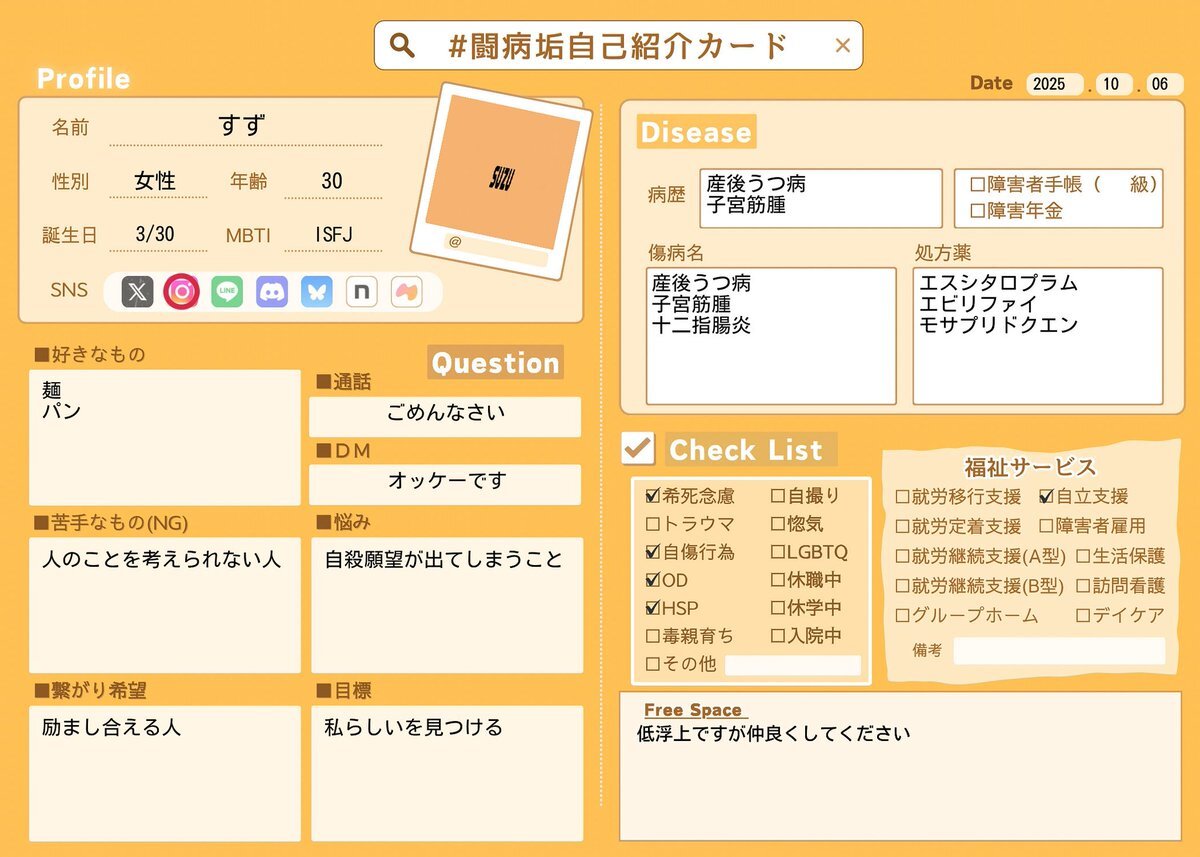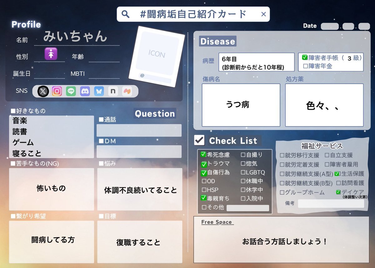 作りたての闘病垢が 検索にちゃんと乗るようになったので 再投稿します〜 相互フォローよろしくお願いします #闘病垢さんと繋がりたい #闘病垢さんと仲良くなりたい #病み垢さんと繫がりたい #闘病垢自己紹介カード pic.x.com/N5GV3DiN7z