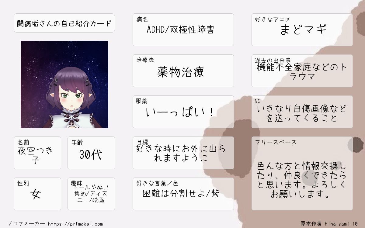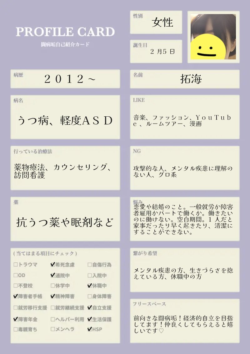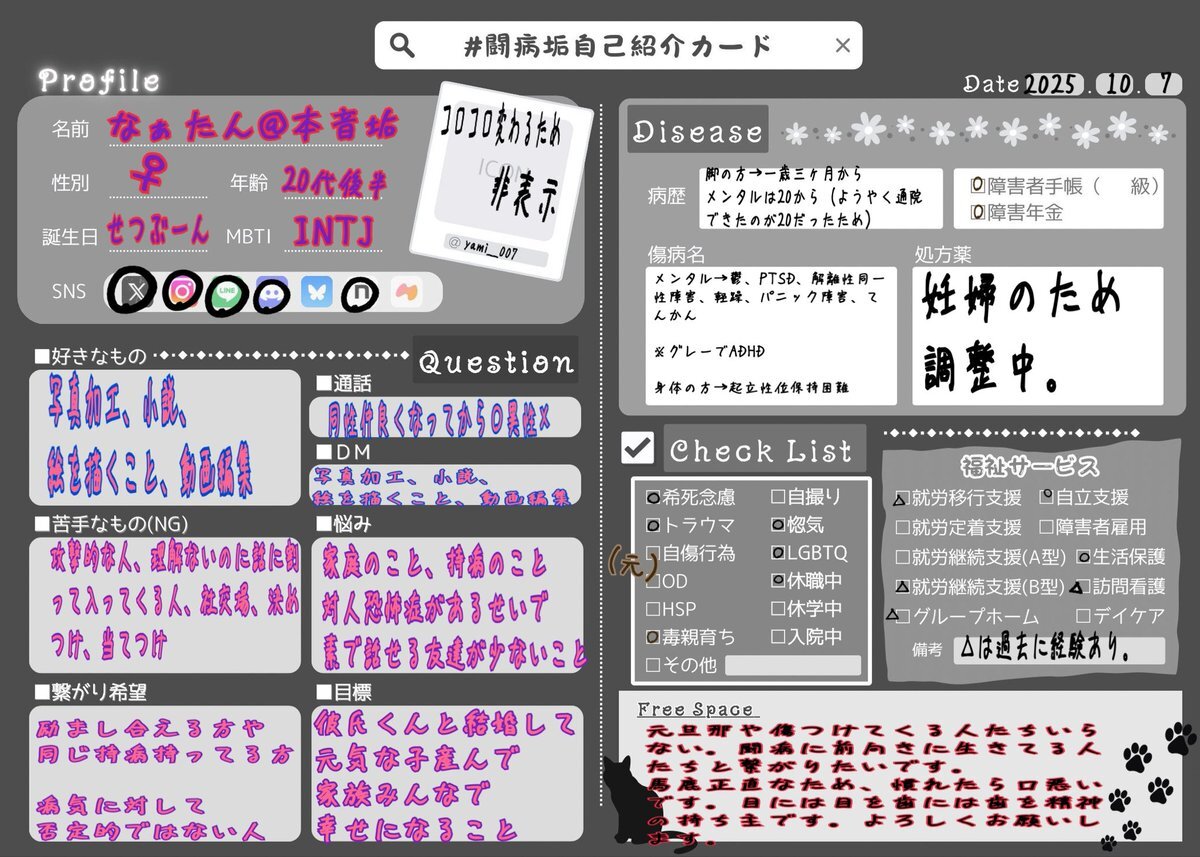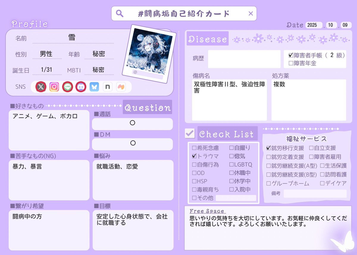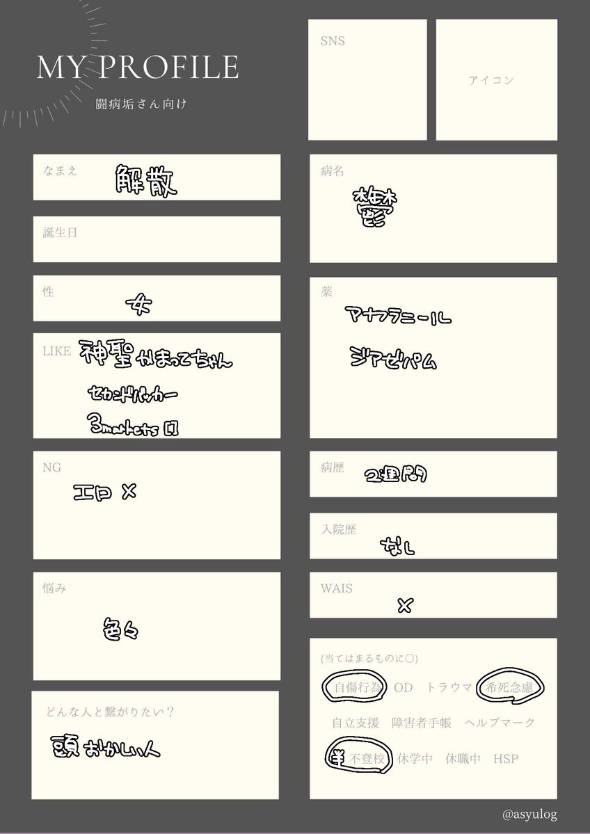 作りたての闘病垢が 検索にちゃんと乗るようになったので 再投稿します〜 相互フォローよろしくお願いします #闘病垢さんと繋がりたい #闘病垢さんと仲良くなりたい #病み垢さんと繫がりたい #闘病垢自己紹介カード pic.x.com/N5GV3DiN7z