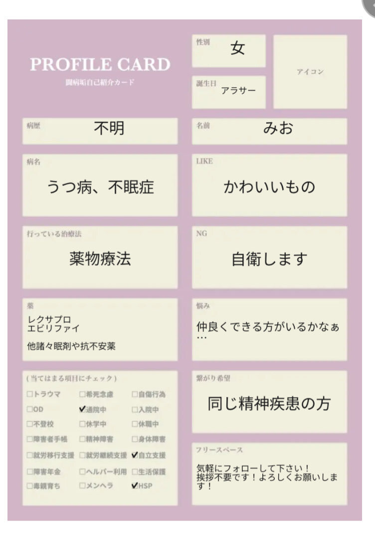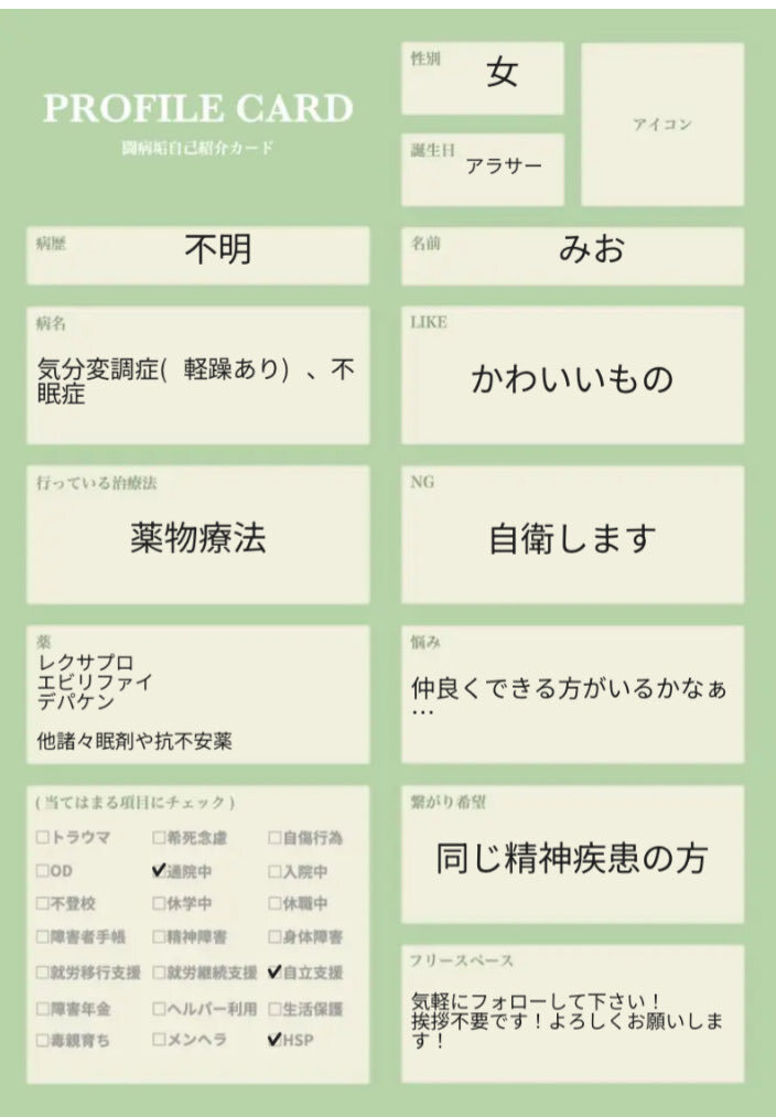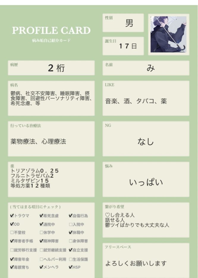 自己紹介カード更新してみました。 お気軽に仲良くしてください。よろしくお願いいたします。 #闘病垢自己紹介カード #精神疾患持ちのための自己紹介カード #精神疾患を持つ人と繋がりたい #闘病垢さんと繋がりたい #病み垢さんと繋がりたい #闘病垢さんと仲良くなりたい #病み垢さんと仲良くなりたい pic.x.com/M7odGIwgxl
