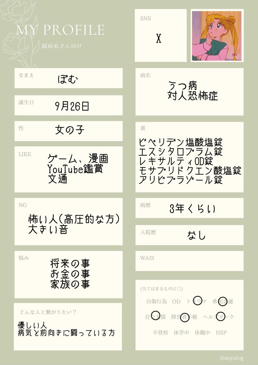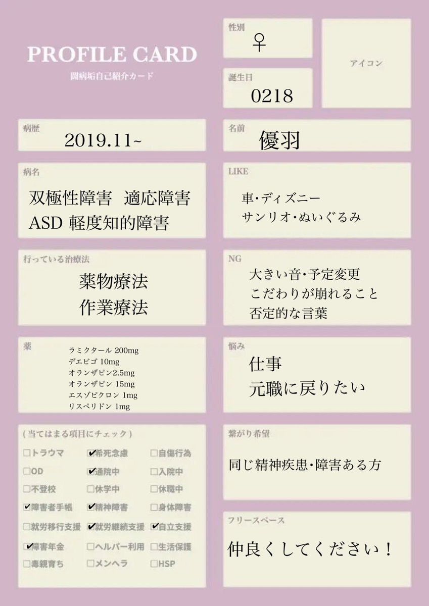 仲良くしてくれたら嬉しいです(◜ᴗ◝ ) よろしくお願いします🫶🫶🫶 #闘病垢自己紹介カード #闘病垢さんと繋がりたい #闘病垢さんと仲良くなりたい #精神疾患を持つ人と繋がりたい pic.x.com/NEl3K6s9Ct