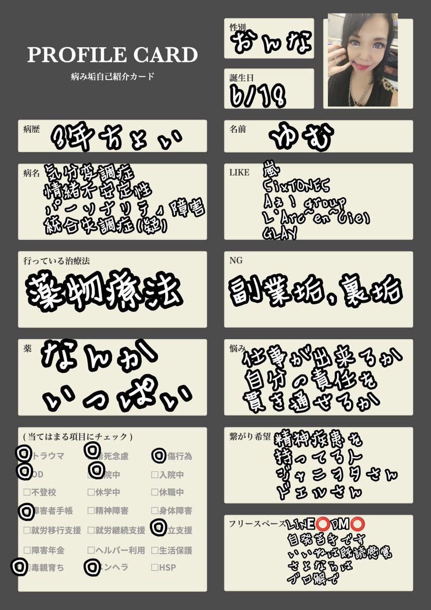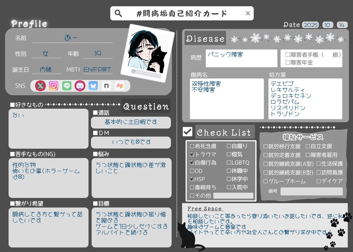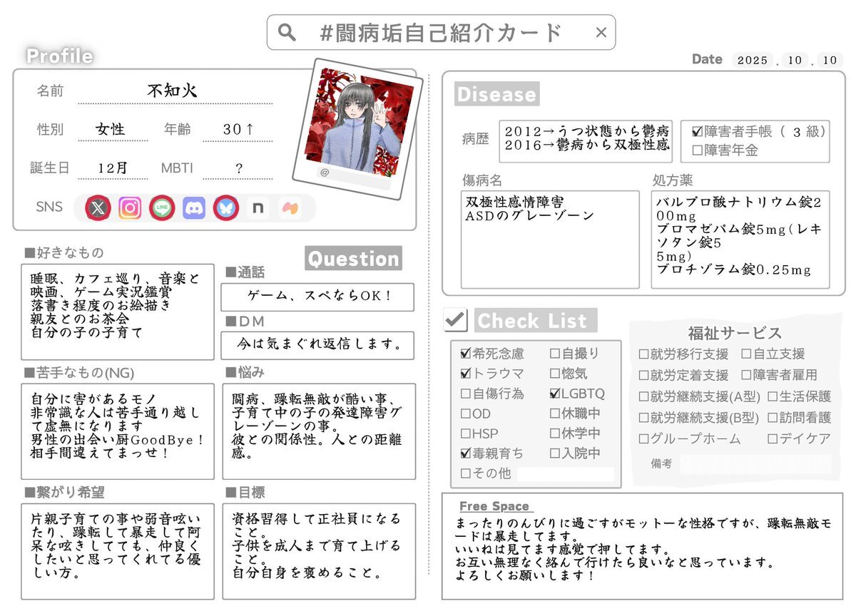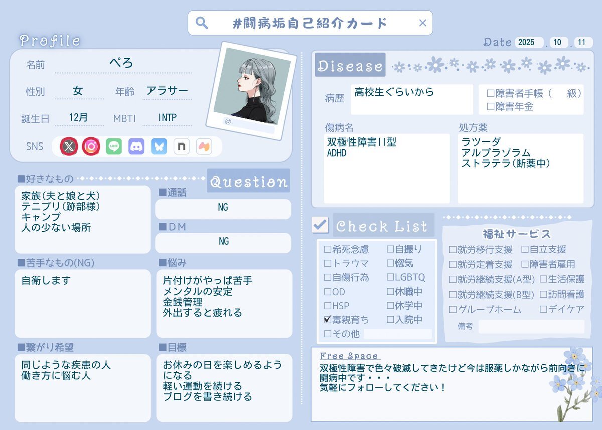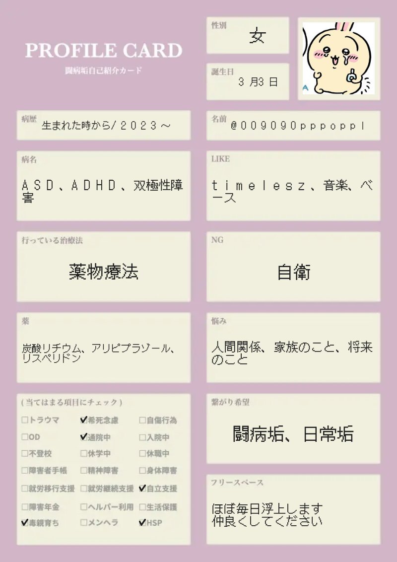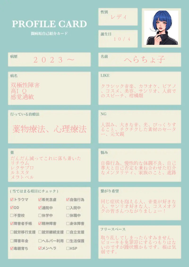 前回のすぐ消しちゃったし最近落ち着いてきたので新しく書きました✩︎⡱ わりと前向きに闘病できてる、はず! いいねorRPでゆっくりお迎えにいきます。 #闘病垢自己紹介カード #闘病垢と繋がりたい #双極性障害 #ADHD pic.x.com/jPK19zylxp