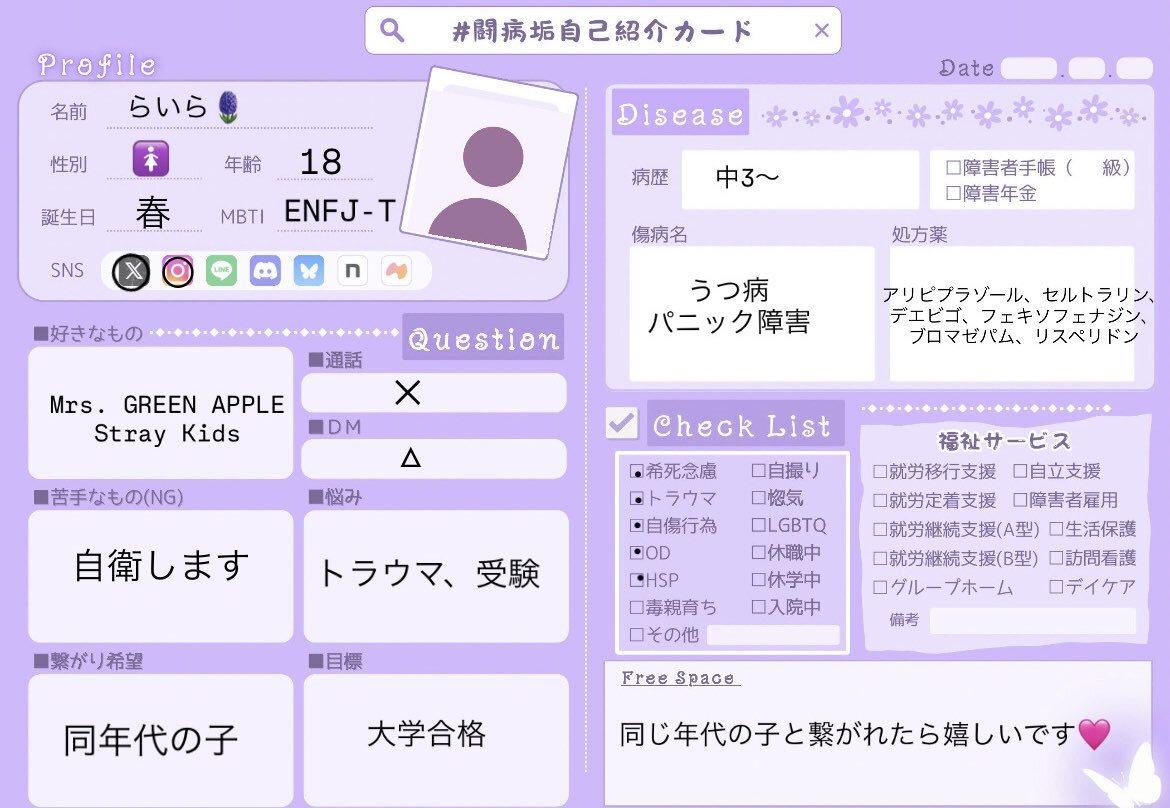 闘病垢自己紹介カード作り直しました〜🪻 同年代の子とたくさん繋がりたいです🩷 #闘病垢自己紹介カード #闘病垢と繋がりたい #うつ病 #パニック障害 #ljk #通信制高校生と繋がりたい pic.x.com/Jenh1cmN47