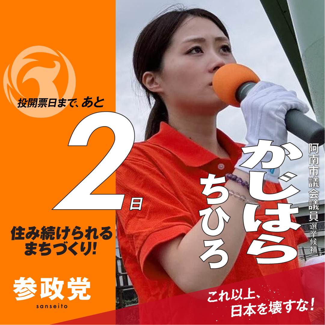 阿南市議会議員選挙6日目になりました! 参政党公認候補 かじはらちひろ よろしくお願いします 今日11月14日(金)は18時から桑野公民館で個人演説会を行います また、午前は加茂谷地区、午後は大潟町近辺を廻ろうと考えています 選挙カーを見かけましたら、ぜひ、お声掛けください