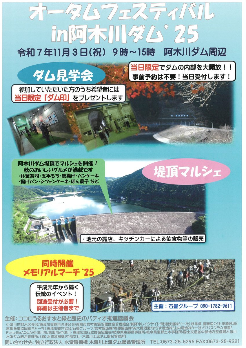 【木曽川上流ダム総合管理所】阿木川ダム 11月3日(祝)に #オータムフェスティバルin阿木川ダム25 を開催します! #ダム見学会 に #堤頂マルシェ 、当日限定の催しで秋の #阿木川ダム を楽しみませんか♪ また、 #メモリアルマーチ も同時開催。 詳しくはチラシをご覧ください!! pic.x.com/8Fkp9uWVHp
