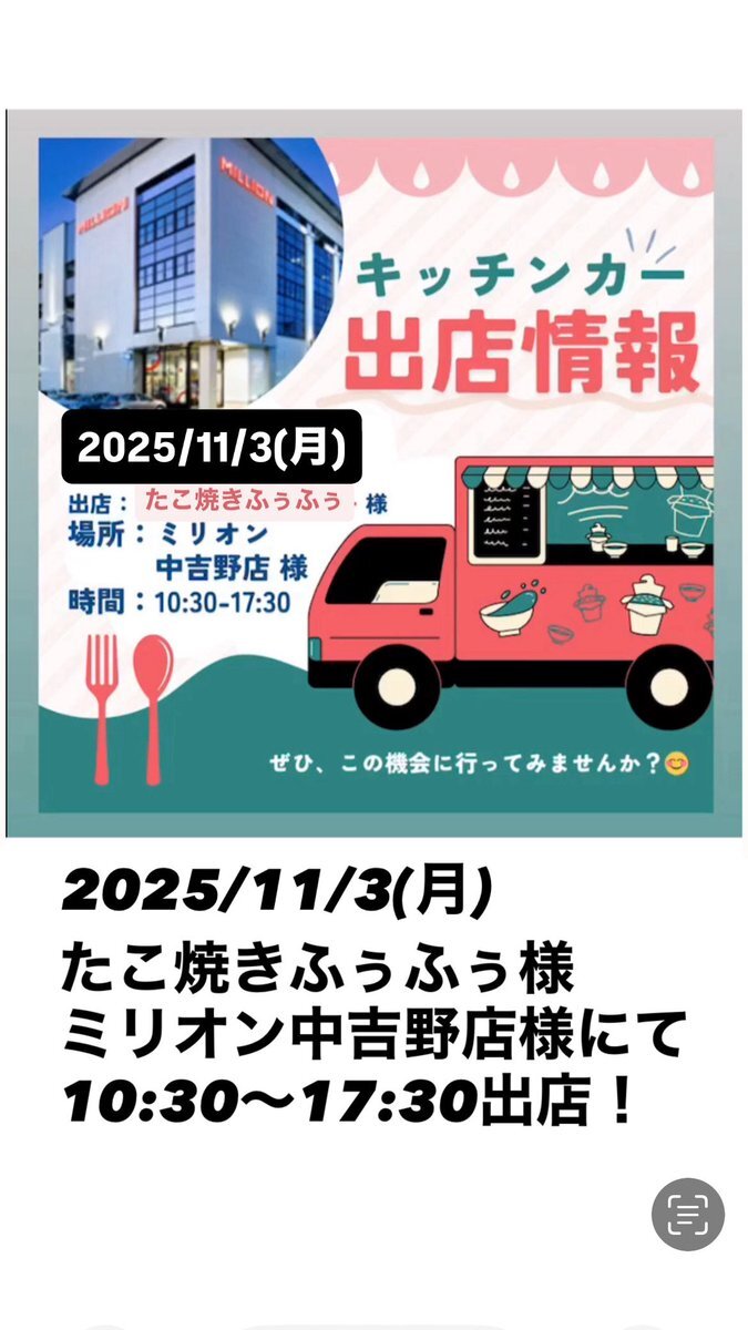 【キッチンカー出店】 たこ焼きふぅふぅ様のキッチンカーが、ミリオン中吉野店様に出店! 10:30〜17:30 是非ご来店ください✨ #阿波の国経済同友会 pic.x.com/CutpVKX3Ly