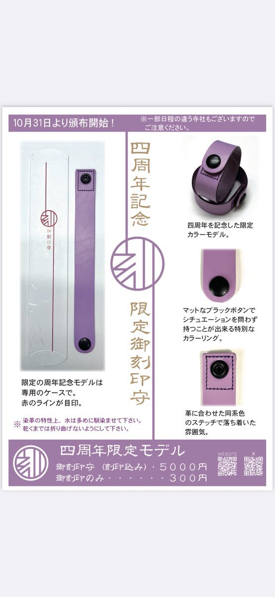 御刻印守の4周年記念限定モデルを11月8日(土)より頒布いたします。 当社での頒布数は10体です。 ご予約は不可、なくなり次第終了となりますので宜しくお願いいたします。 #御刻印 #疾風巡拝 #限定御刻印守 #4周年記念御刻印守 pic.x.com/2gmmq0GyKM