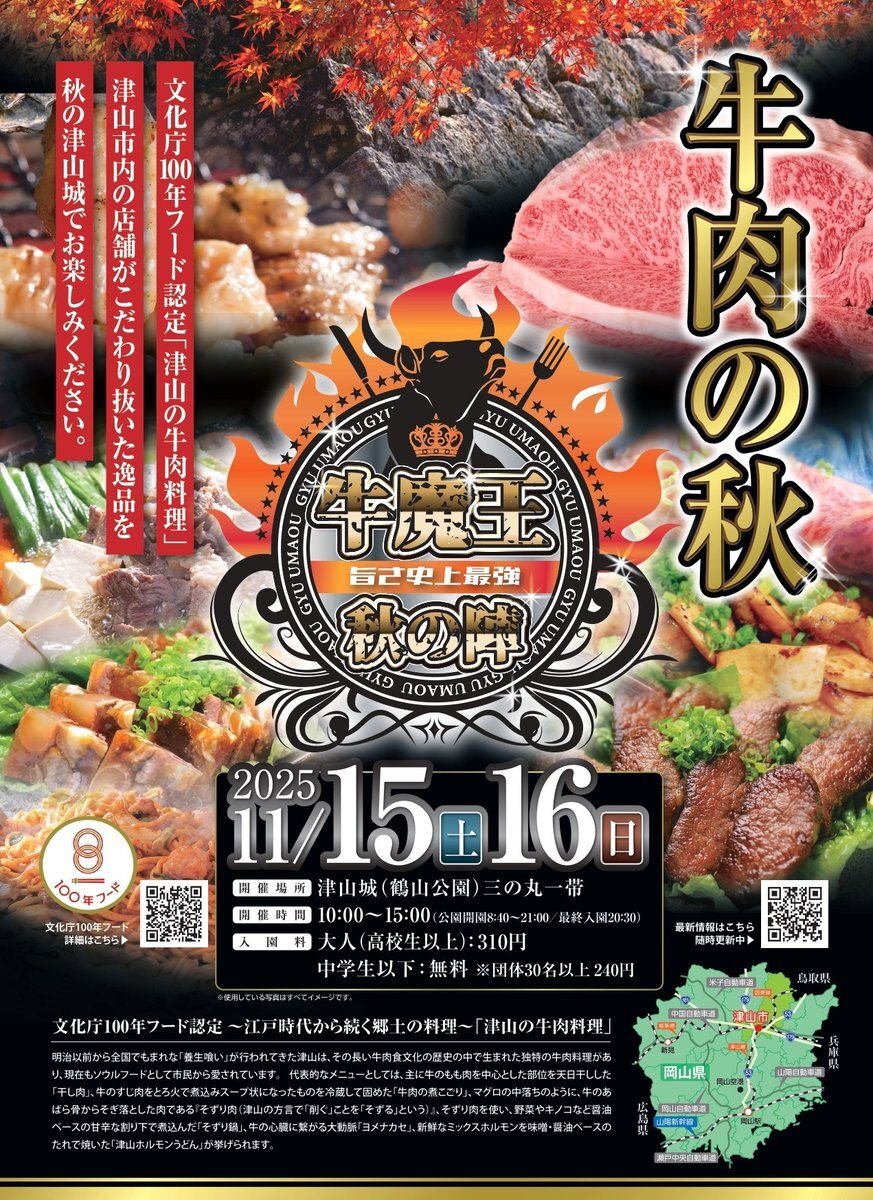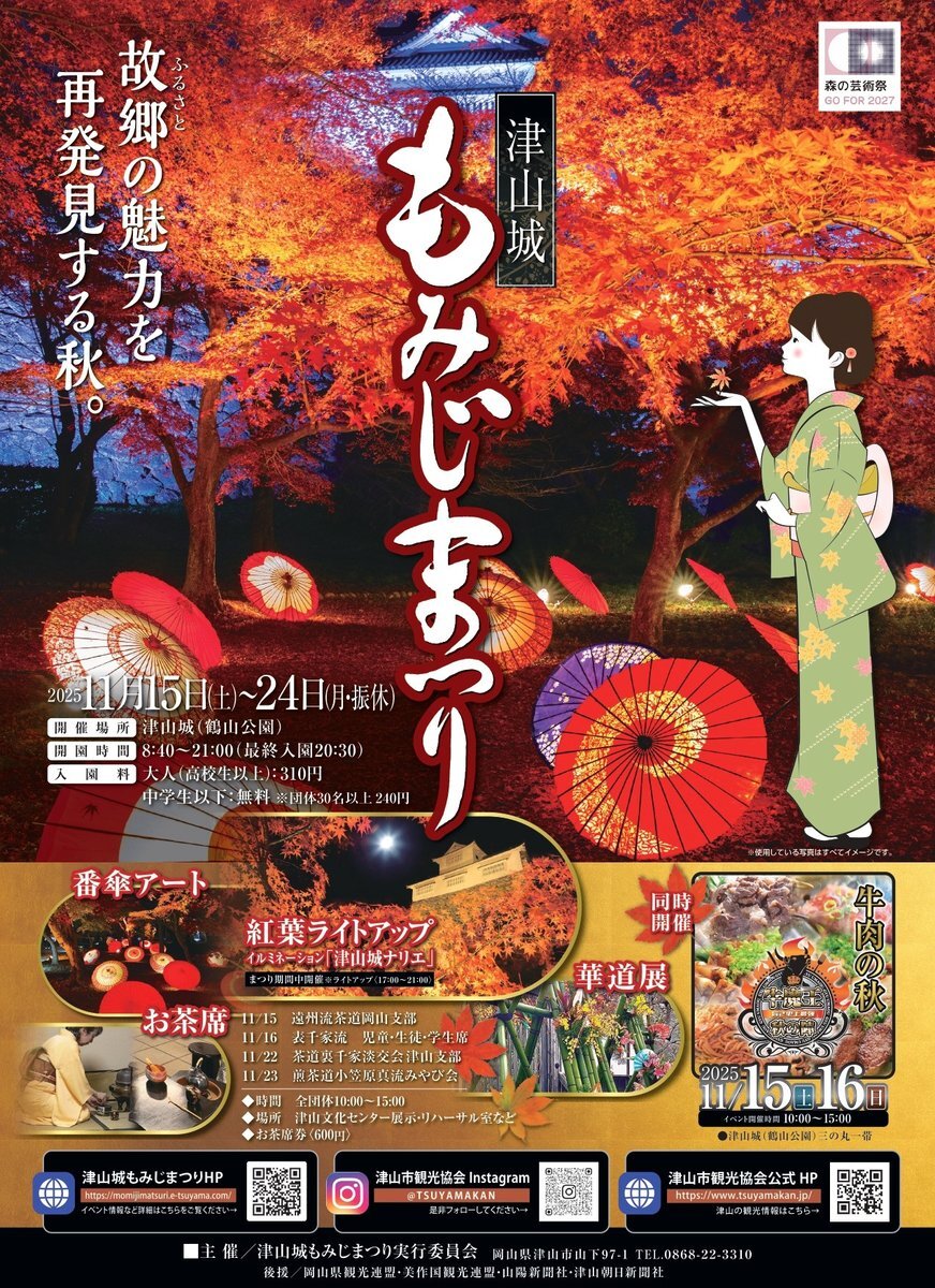 #津山城もみじまつり #牛魔王 秋の陣 同時開催! 2025.11.15(土)~24(月・振) 8:40~21:00 お茶席や華道展が行われ 夜には紅葉ライトアップを実施 また、津山市内の店舗が こだわりぬいた絶品グルメを 味わうことができます。 津山もみじまつり #限定御城印 も販売! okayama-kanko.jp/event/detail_1… pic.x.com/HCHJR3G87s