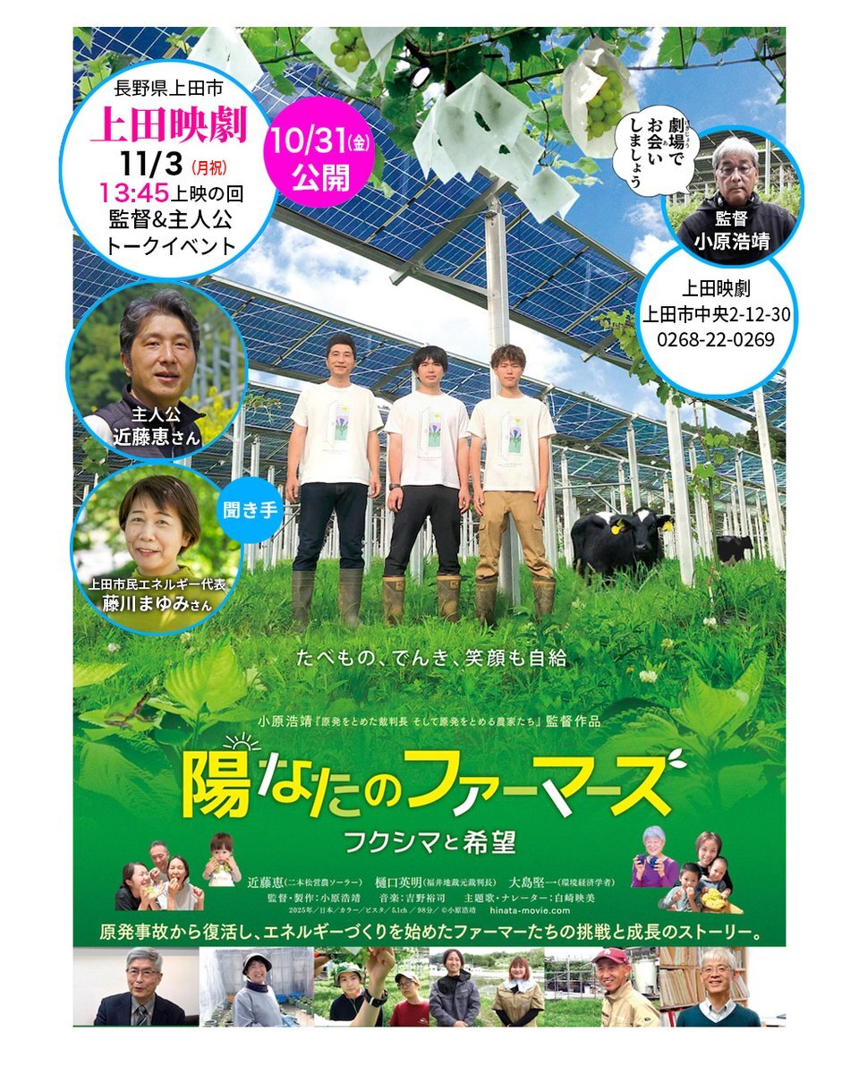 #陽なたのファーマーズ #上田映劇 公開!10/31(金) 11/3(月祝)13時45分上映後、監督&主人公舞台挨拶です! 聞き手は上田市民エネルギー代表・藤川まゆみさんです! uedaeigeki.com/news/31201/ pic.x.com/kCib4IeUJ3