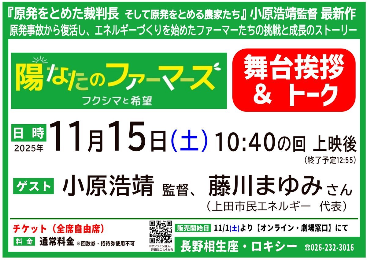 \\『陽なたのファーマーズ フクシマと希望』 舞台挨拶&トーク開催決定‼️// 11/14(金)から当館にて上映の『#陽なたのファーマーズ フクシマと希望』🐄 翌日11/15(土)には、#小原浩靖 監督、#藤川まゆみ さん(#上田市民エネルギー 代表)による舞台挨拶&トークが決定しました‼️ x.com/aioiza_roxy/st…