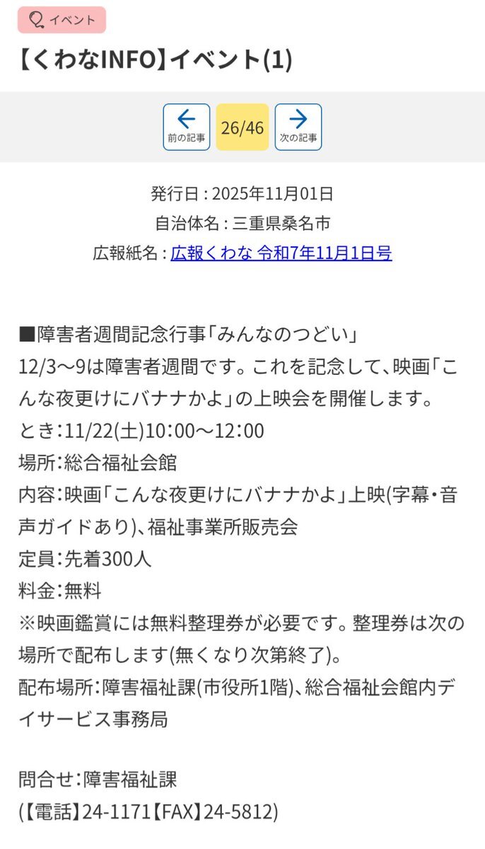 ☆*★上映予定☆*★ 障害者週間記念行事「みんなのつどい」 映画「こんな夜更けにバナナかよ 愛しき実話」 日時 : 11/22 (土) 10:00~12:00 場所:桑名市総合福祉会館 ※無料整理券の配布有り 【くわなINFO】イベント(1) – マイ広報紙 mykoho.jp/article/242055…
