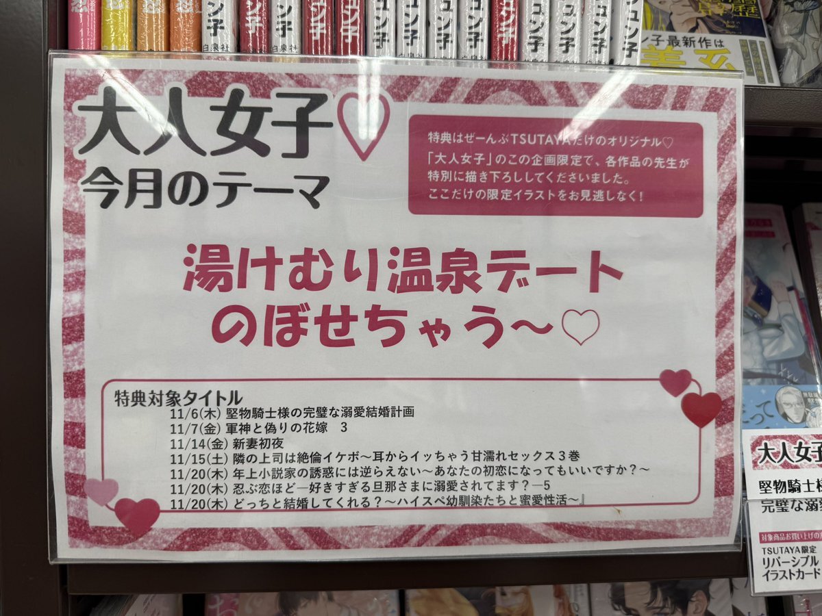 【BOOKからのお知らせ】 #大人女子 更新❤️ #新妻初夜 #隣の上司は絶倫イケボ TSUTAYAだけのオリジナル特典がついてます😍お買い上げの方に、各作品の先生が特別に描き下ろしてくださった #イラストカード プレゼント❣️なくなり次第終了‼️ #TSUTAYA限定特典 #TSUTAYA安中店 pic.x.com/VbthQRfCBd