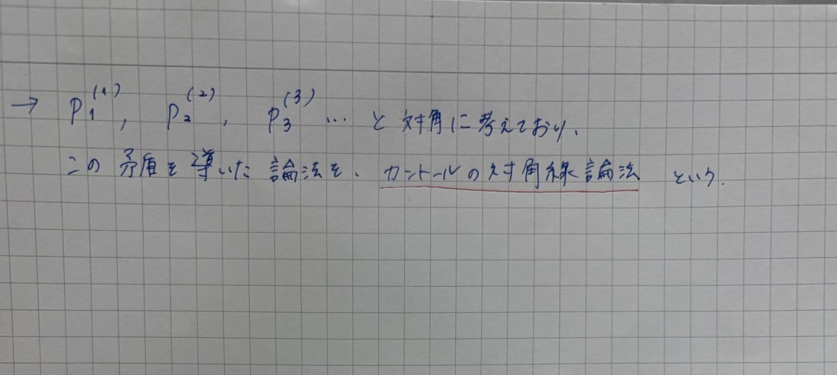 今日は、すうがくぶんか講座「集合と位相 入門の入門」の「§4カントールの対角線論法」を受講しました。 無限集合から可算集合を引いても濃度は変わらないという話。無限すごいですね。こういうの好き。 やっと入門の入門終わりました。これで入門できる!わーい🙌 #集合と位相 #すうがくぶんか pic.x.com/cTyRh8Zfkt x.com/fumi_fum_fum/s…