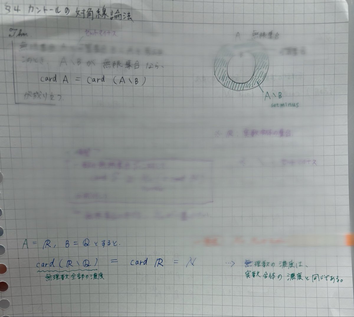 今日は、すうがくぶんか講座「集合と位相 入門の入門」の「§4カントールの対角線論法」を受講しました。 無限集合から可算集合を引いても濃度は変わらないという話。無限すごいですね。こういうの好き。 やっと入門の入門終わりました。これで入門できる!わーい🙌 #集合と位相 #すうがくぶんか x.com/fumi_fum_fum/s…