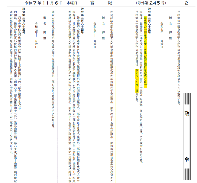 離婚後の共同親権の選択可などの民法改正の施行日が、正式に「令和8年4月1日」と官報で公布されました。 ■官報 kanpo.go.jp/20251106/20251… (PDF) 令和8年度司法書士試験から出題範囲になることが確定しました。