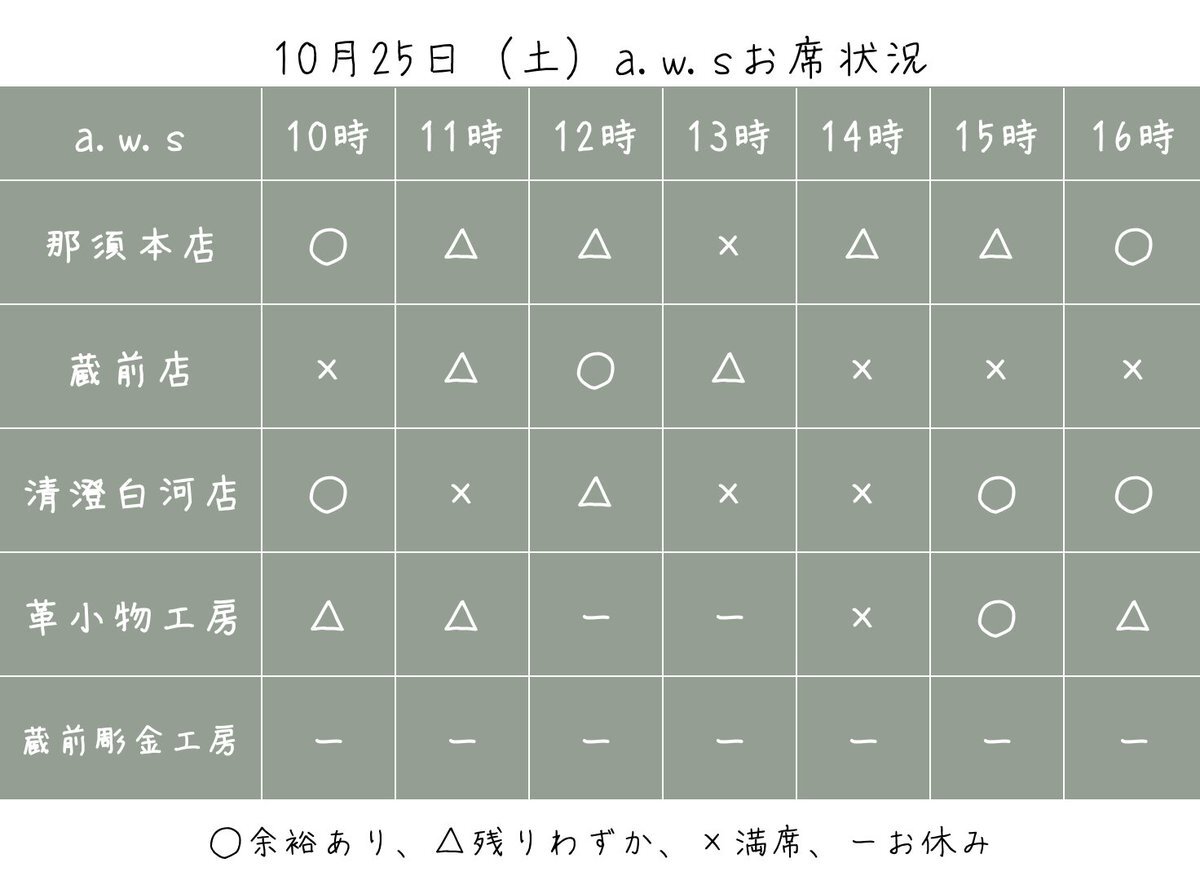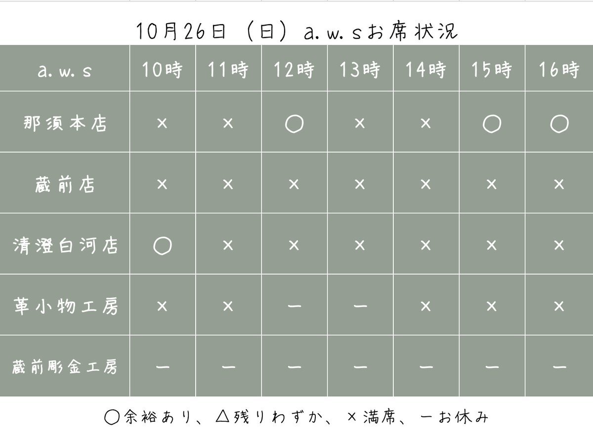 10月25日☂️土曜日・a.w.sお席の状況 おはようございます☺️ 雨なのでお車や移動など、どうぞお気をつけて♡ 本日も皆様のお越しをお待ちしております🤗 #体験工房 #那須 #観光 #雨の日のお出かけ #蔵前 #清澄白河 #指輪作り #ペアリング作り pic.x.com/L7O2Hjb5gM