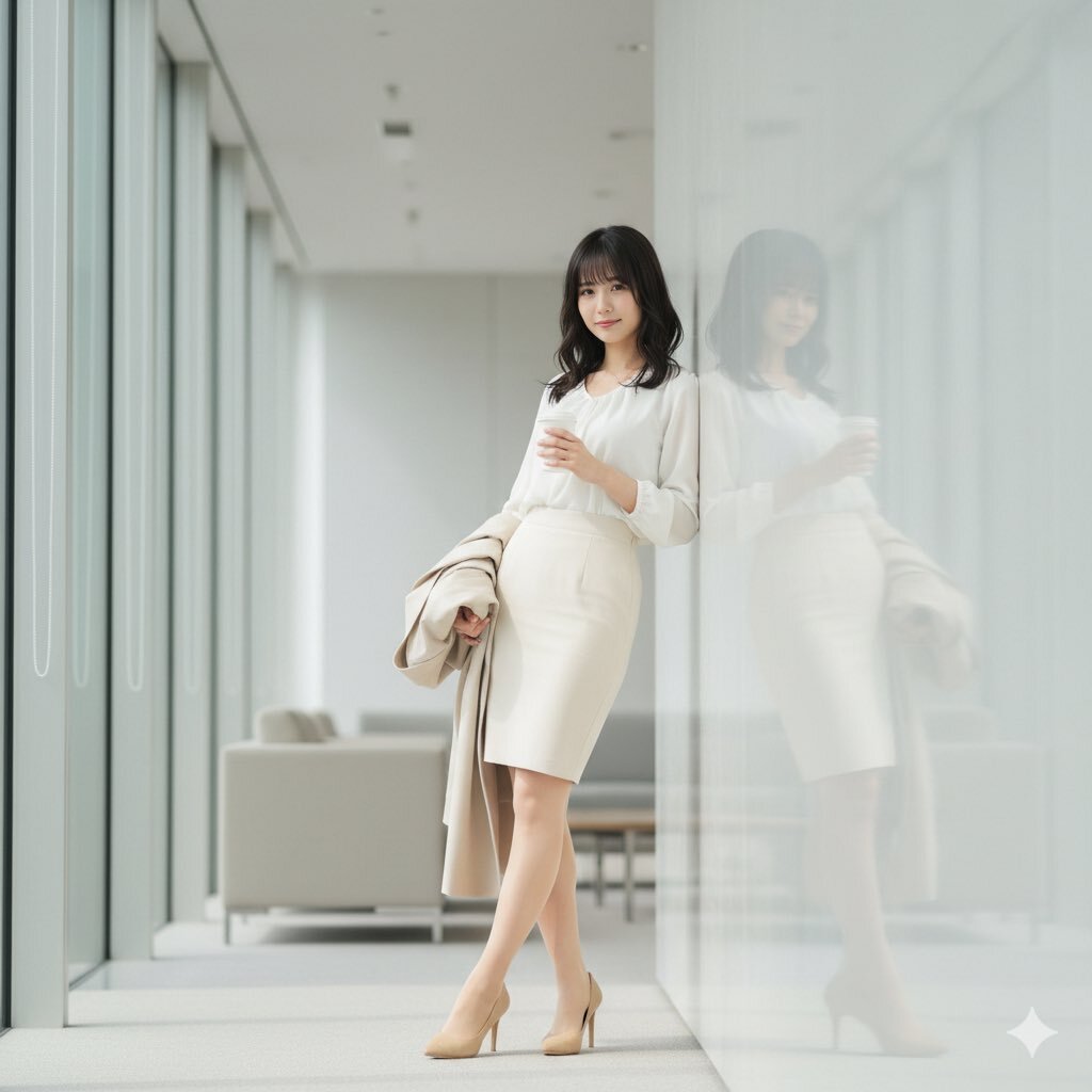ふぅ、やっと帰ってきました。やっぱり一日頑張ると、足が少し疲れますね。貴方は、お仕事のあと、まず何をしますか? #雨宮ちぐさ #AIart #OLコーデ #美脚 pic.x.com/WVgrz2GRPR