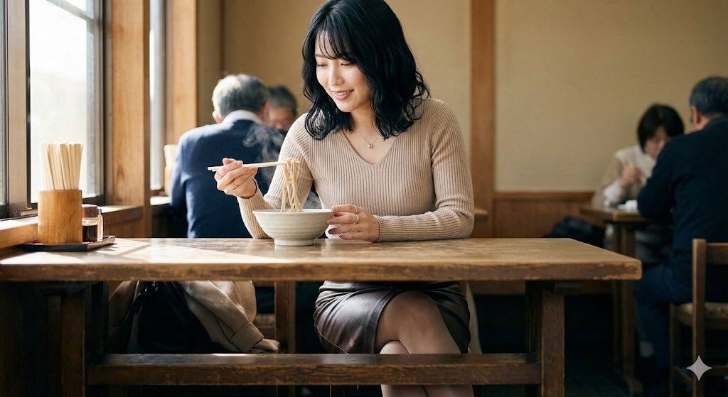 午後の会議の前に、今日はお蕎麦でさっぱりと。 ふふ、ズルズルって音立てて食べるの、貴方の前だと少し恥ずかしいかな...なんて。 エネルギーチャージ完了ですね。 貴方はお蕎麦、温かいのと冷たいの、どっちが好きですか? #雨宮ちぐさ #AIart #ランチ #仕事着 #美脚 pic.x.com/YkUyGBYrSM